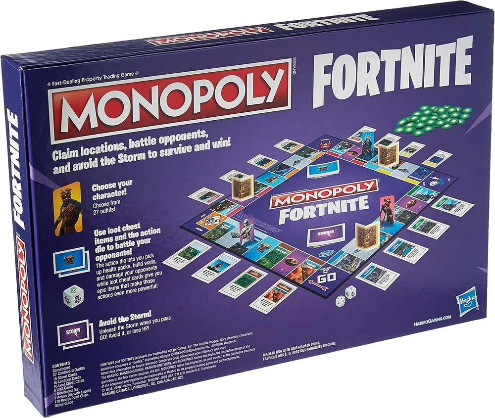 Min. Number of Players:2 playersCustom Bundle:NoBrand:HasbroYear:2019gtin13:0630509810628Character Family:FortniteUPC:0630509810628Recommended Age Range:13+Game Type:Board GameType:Game BoardGame Title:Monopoly: FortniteCountry/Region of Manufacture:ChinaTheme:FantasyModified Item:No