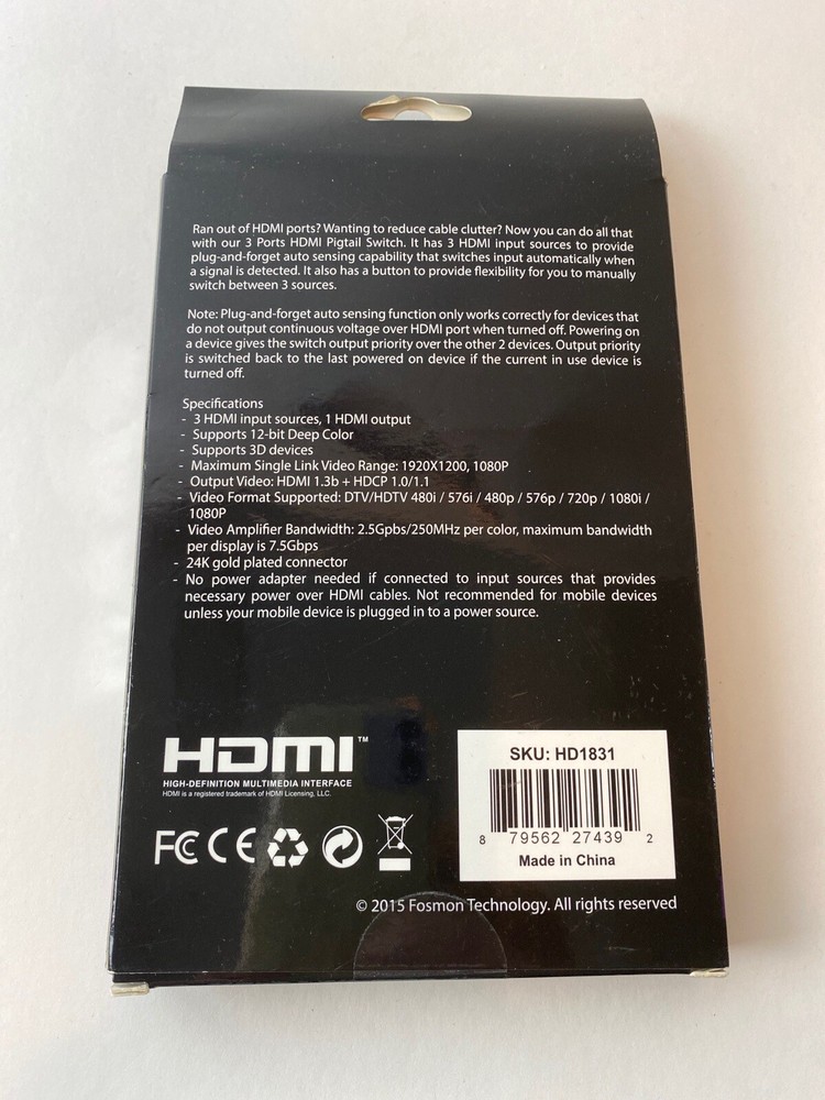 Fosman HDMI 3 X 1 Pigtail Switch New With 50cm HDMI Cable Please visit my store at https://www.ebay.com/str/theuniqueredhead . Thank you for your consideration. Please message me if you have any questions. I do combined shipping on my items in the store. G1033