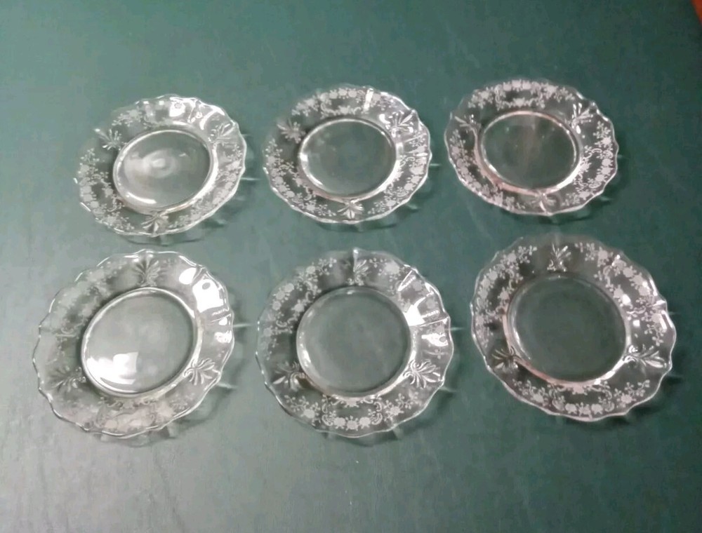 The Fostoria Meadow Rose 6" Dessert Bread Plates come in a set of 6 and are elegantly crafted from clear glass in the United States. These round bread and butter plates feature a delicate floral design, making them a charming addition to any table setting. Perfect for serving desserts or bread, these plates showcase the elegant glass production style that Fostoria is known for. These plates are in good used condition with no chips or cracks. See photos.