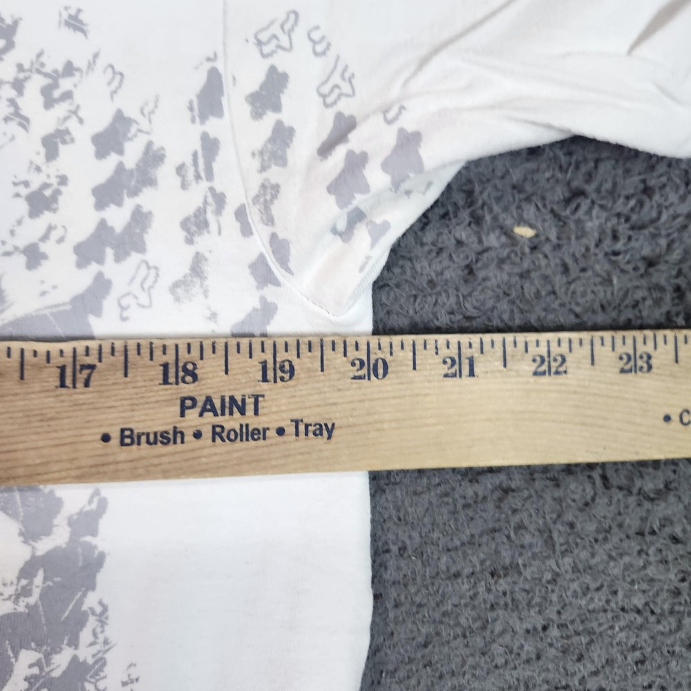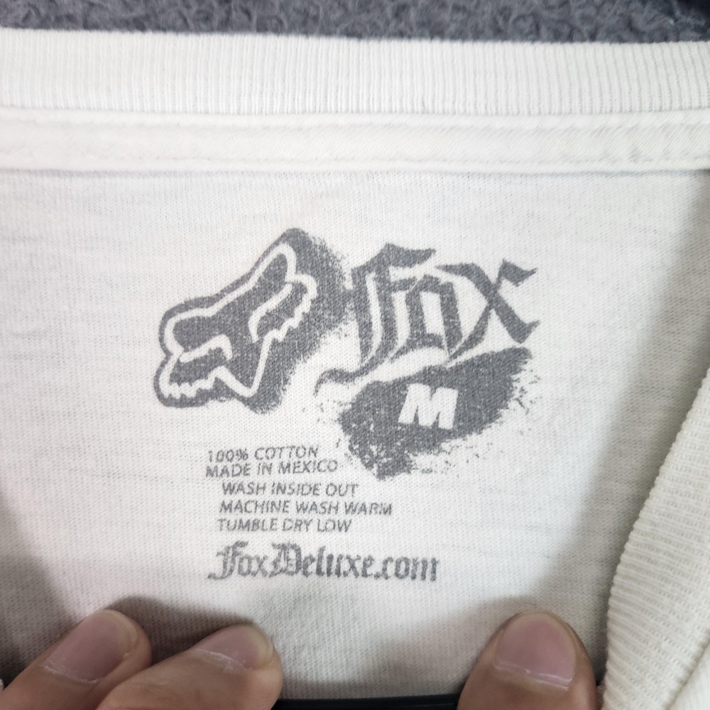 Brand: Fox Racing. Item: Mens short sleeve graphic T-shirt. Color: White body with gray and black graphic print. Size on tag: Mens Medium (M). Material: 100% cotton. Country of origin: Made in Mexico. Tag details: Tagless printed neck graphic with Fox head logo, Fox wordmark, size M, care instructions, and branding. Front design: Large stylized "Fox" text and Fox head logo at chest with an allover scattered pattern of small Fox logos and abstract graphics in gray. Back design: Solid white back panel with no printed graphic. Construction details: Crew neckline with ribbed collar, short sleeves, straight hem, regular fit cotton tee. Features: Tagless printed neck label, soft cotton fabric, bold Fox Racing motocross-inspired front graphic, casual everyday streetwear style, mens medium sizing.