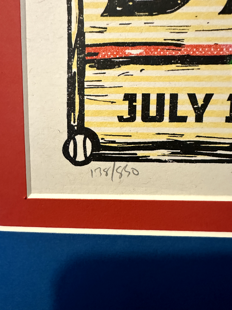 Capture a piece of music history with the 31" X 25" Framed Dead & Company Concert Poster from their performance at Wrigley Field, in Chicago, IL, Home of the Chicago Cubs on July 1, 2017. Very Rare numbered poster # 178 of 850. Poster signed by artist. Excellent condition. Celebrate the iconic Grateful Dead spin-off with this original piece, a must-have for any collector or fan of the rock and pop genre. Expertly crafted in the United States, this poster is not just a visual memento but a tribute to the enduring legacy of the band. It's a standout addition to any music memorabilia collection, bringing a touch of the Grateful Dead's spirited energy into your space. Poster description: Black frame with a sheet of glass, blue outer matting, red/white inner matting; Skeleton Hobo, Chicago Skyline, Red VW Bus
