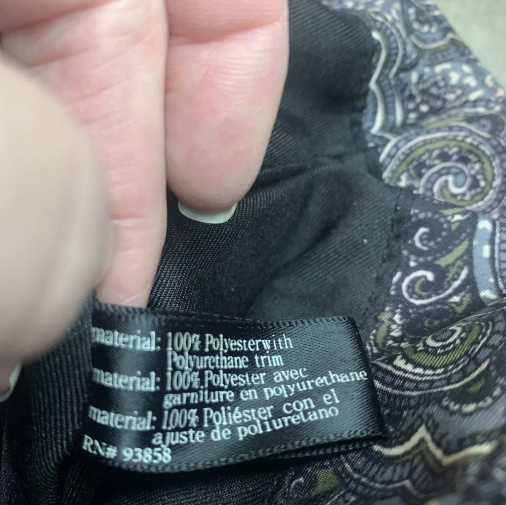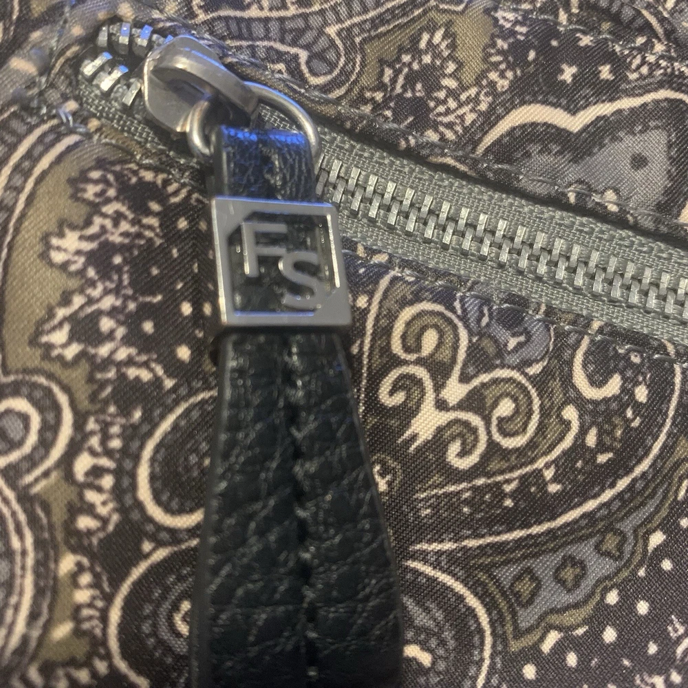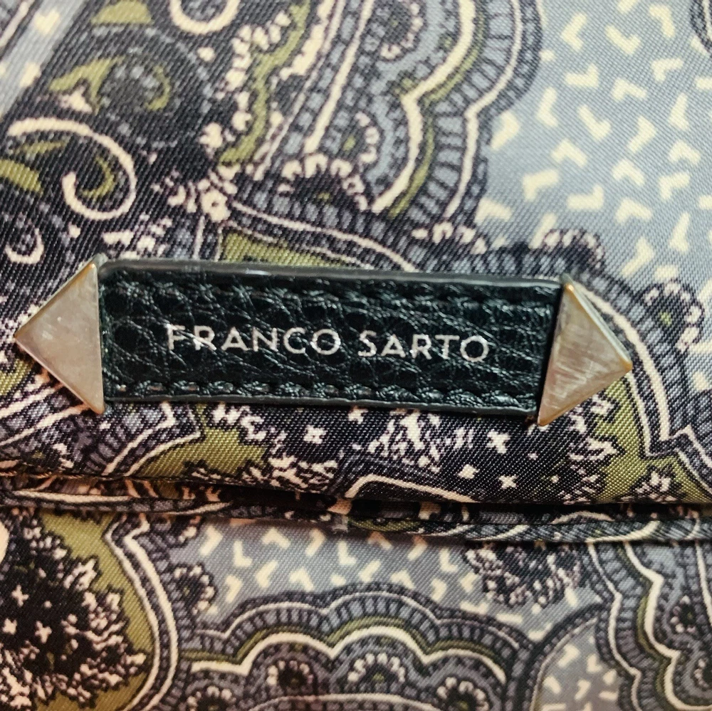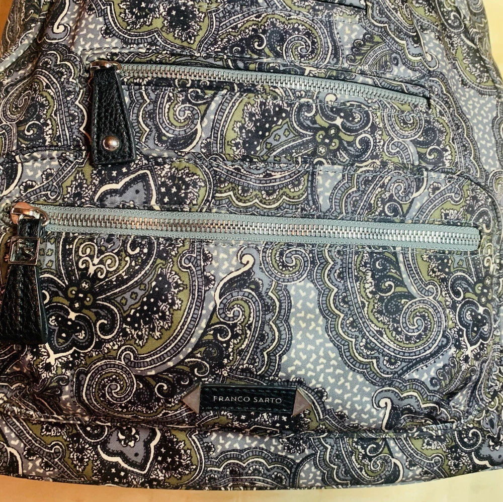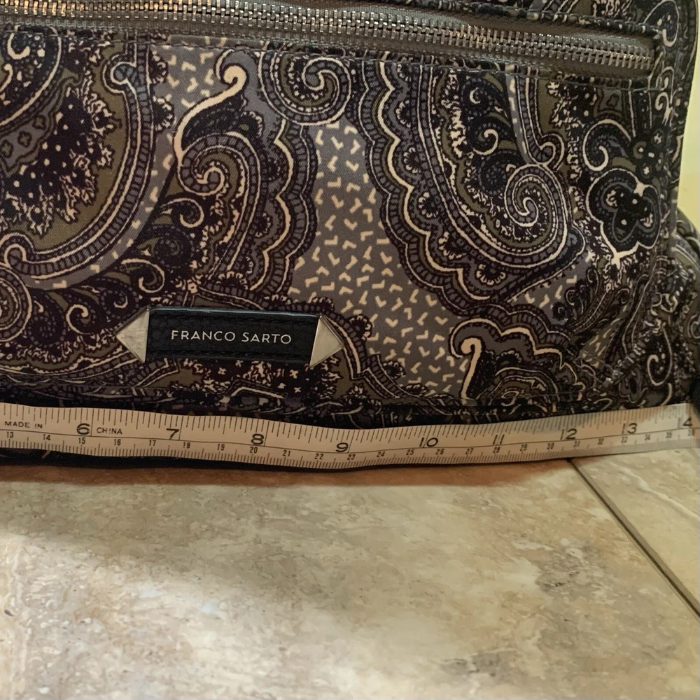 This is a beautiful warm colored shoulder bag, perfect for the cooler weather. There is a small wear spot(pictured) under one handle; not easily spotted. There is no long shoulder strap. It’s so clean and comes from a smoke free home. This stylish Franco Sarto shoulder bag is perfect for any occasion. The beautiful paisley pattern in a mix of black, warm green, grey, and white colors gives it a retro vibe that is sure to turn heads. The bag has a zip and snap closure and features both inner and outer pockets for ample storage space. Measuring 14 inches in width, 12 inches in height(not including handle height), and 5 1/2 This inches in depth, this medium-sized bag is made of durable polyester material and has a black handle/strap color. The hardware color is silver, and the bag's lining color is black With its spacious interior and multiple pockets, this bag is perfect for everyday use or as a purse for a night out. Thank you for visiting my eBay store. Please feel free to reach out if you require further information about this beautiful handbag.