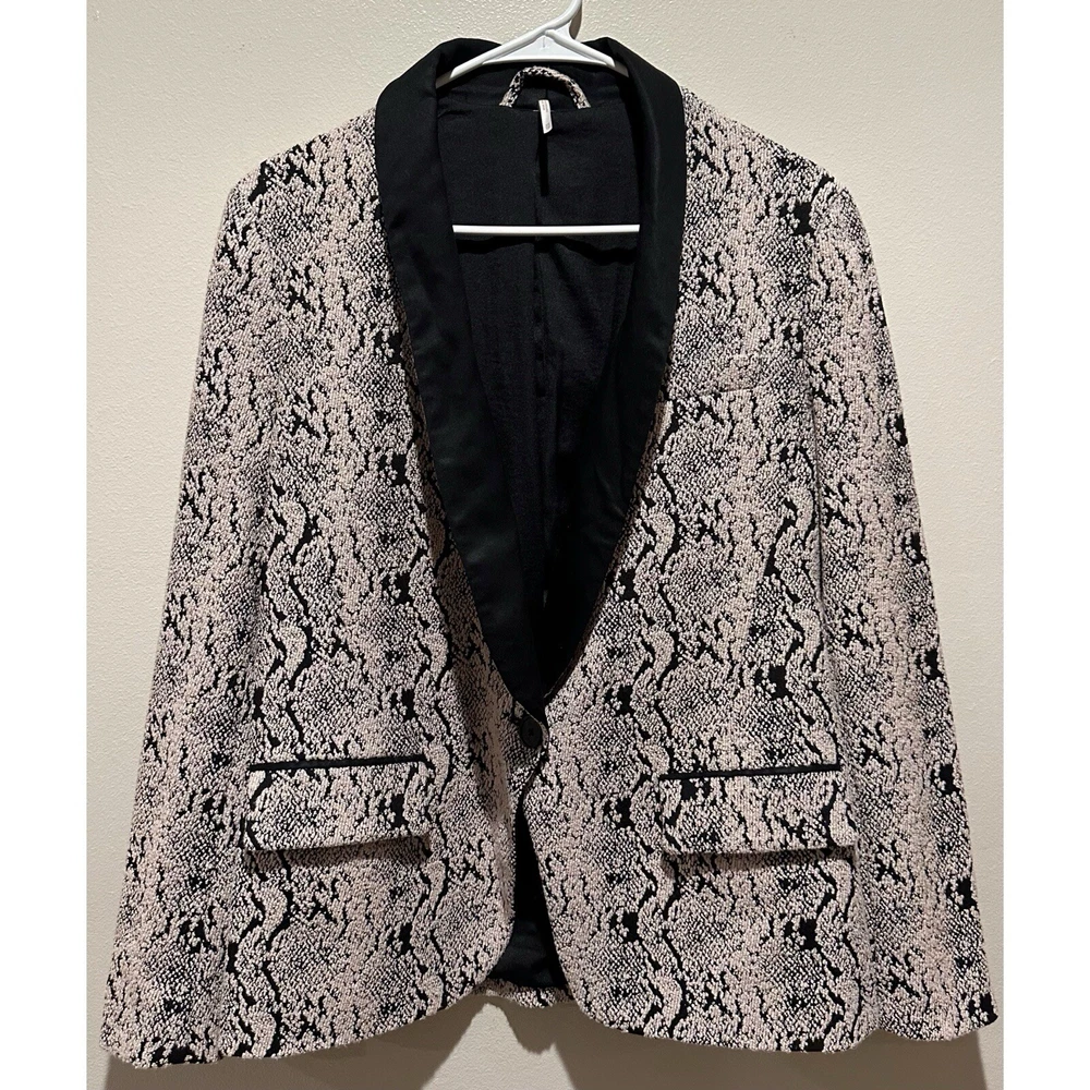 Elevate your style game with this stunning Free People Jacquard Snakeskin Tuxedo Jacket Tapestry Blazer. The mid-length blazer features an animal print pattern in a multicolor palette, with a collared neckline and button closure. The outer shell is made of soft cotton, and the lining is made of polyester, providing comfort and breathability. • Black Satin Shawl Collar • Fully Lined • Faux Flap Pockets • Single Back Vent is Still Stitched Closed • One Button Closure • 40% Polyester, 37% Cotton, 22% Rayon, 1% Spandex Measurements Chest 19" lying flat Shoulder 16" lying flat Sleeve 22" Length 28" from fold of collar to end of garment No rips holes or stains! EXCELLENT CONDITION!