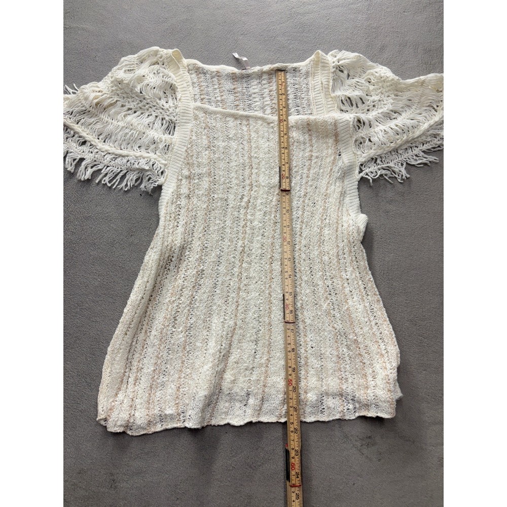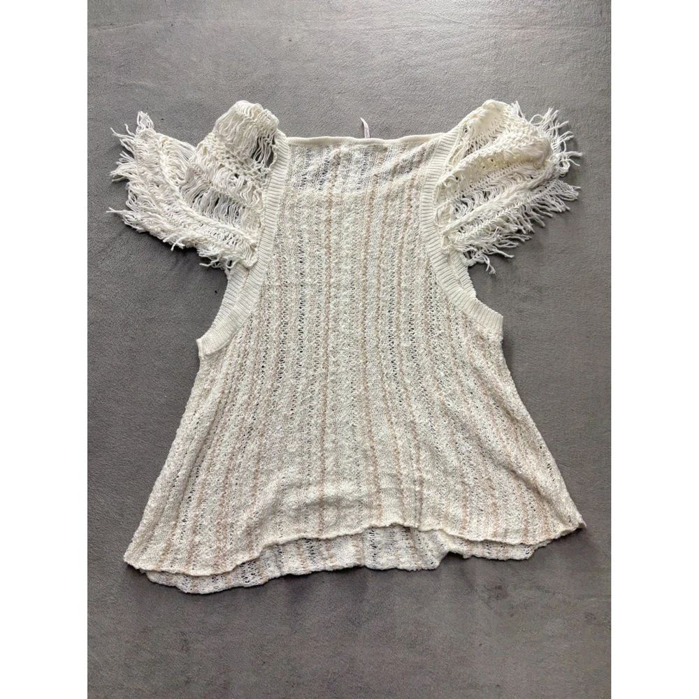White textured knit top with distinctive fringe detailing on the sleeves. A square neckline adds a classic touch to this airy piece. Perfect for a beach vacation or a casual weekend outing. Measurements: • Length: 24 in • Bust: 17 in Style: Tunic Department: Women Material: Cotton Blend Neckline: Square Neck Sleeve Length: Short Sleeve Type: Sweater Features: Sheer, Lightweight Pattern: Striped Sleeve Type: Flutter Sleeve Fabric Type: Knit Accents: Fringe, Crochet Knit Style: Open-Knit Season: Spring, Summer Fit: Relaxed Occasion: Casual Keywords: Free People, knit top, fringe detail, square neck, bohemian, festival wear, summer top, lightweight, textured knit, resort wear, beach style, casual chic, unique sleeves