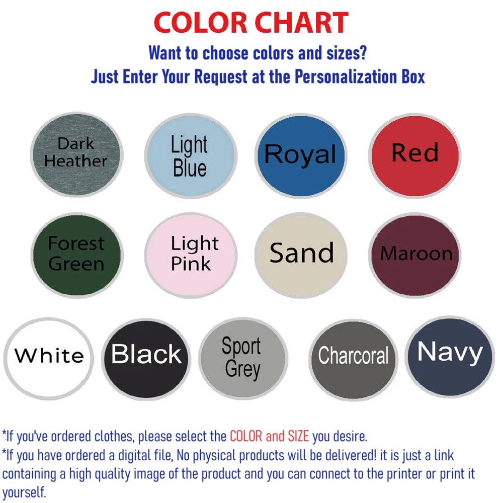 If you are ordering a t-shirt, hoodie, or sweatshirt, please message me or note the color and size you require. We have sizes available from S-5XL and prices are the same for all sizes If the product you purchased is a name or number customized product, please note in the Personalization box or send us a message. To ensure the fastest delivery time, customers in each region will receive their shipments from the warehouse located in that region Delivery Time Customers in the USA, Canada: Shipped from the USA warehouse, delivery within approximately 5-9 business days. Customers in the UK and EU: Shipped from the EU warehouse or UK warehouse, delivery within approximately 4-8 business days. Customers in Australia: Shipped from the Australia warehouse, delivery within approximately 4-8 business days. If you want to buy a Sweatshirt, Hoodie or Tank Top but there are no options on the product listed, please message us for assistance. A. ORDER PLACEMENT INSTRUCTIONS Please review all the provided photos. Select your preferred shirt size. Indicate your color preference. Click the "ADD TO CART" button. You can return to add more items for your family or proceed to checkout. If you have added any additional notes, continue by choosing "Proceed to checkout." Your selected shirt will be prepared for shipping. B. PRODUCT DETAILS A comprehensive size guide can be found among the item photos. The materials used may vary slightly depending on the chosen product type, such as a t-shirt, sweatshirt, or hoodie. Irrespective of the product type, our primary focus remains on comfort and quality. Our t-shirts are carefully crafted from 100% ring-spun cotton, except for the Sport Grey version, which combines 90% ring-spun cotton and 10% polyester. The Dark Heather option blends 65% polyester and 35% cotton. All our products are lightweight, with a fabric weight of 4.5 oz/y² (153 g/m²). We have pre-shrunk them to minimize potential shrinking after washing. To enhance durability, we have included shoulder-to-shoulder taping. Additionally, the quarter-turn design prevents creasing at the center, ensuring a tidy appearance. Feel free to explore our store for the perfect gift suitable for any occasion. FAQs: I JUST PLACED AN ORDER, WHEN WILL IT SHIP? It is noted that your order processing time can be affected if the initial information provided to us is insufficient or incorrect such as inaccurate or incomplete payment; incorrect address information and insufficient product measurements. We seek your understanding and support if it is the case. FEEDBACK Please feel free to contact us if you have any questions about the merchandise. If you are satisfied with the item, please leave a positive feedback and full-star rating for us! Your satisfaction is the most important thing to us. Please contact us first if you could not leave a positive feedback! Just let us know what the problem is, and we are happy to help. CONTACT US If you have any questions or suggestions, please email to us immediately. Your messages will be answered within 24 -48 hours. We shall try our best to solve your problem to your satisfaction. Have A Nice Day! Thank you On May 12, 2024 at 19:12:27 PDT, seller added the following information: On May 13, 2024 at 20:05:16 PDT, seller added the following information: On Jun 22, 2024 at 07:23:36 PDT, seller added the following information: On Aug 19, 2024 at 22:34:54 PDT, seller added the following information: On Aug 20, 2024 at 23:53:24 PDT, seller added the following information: