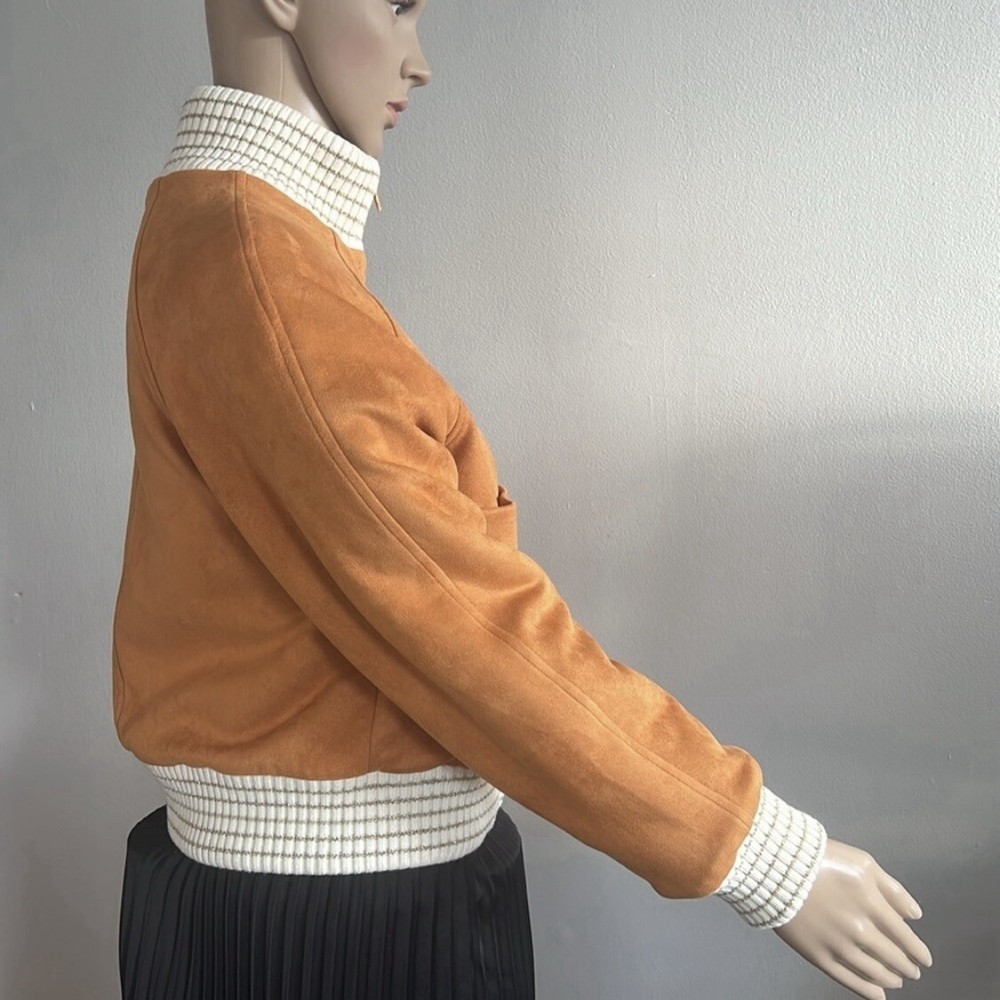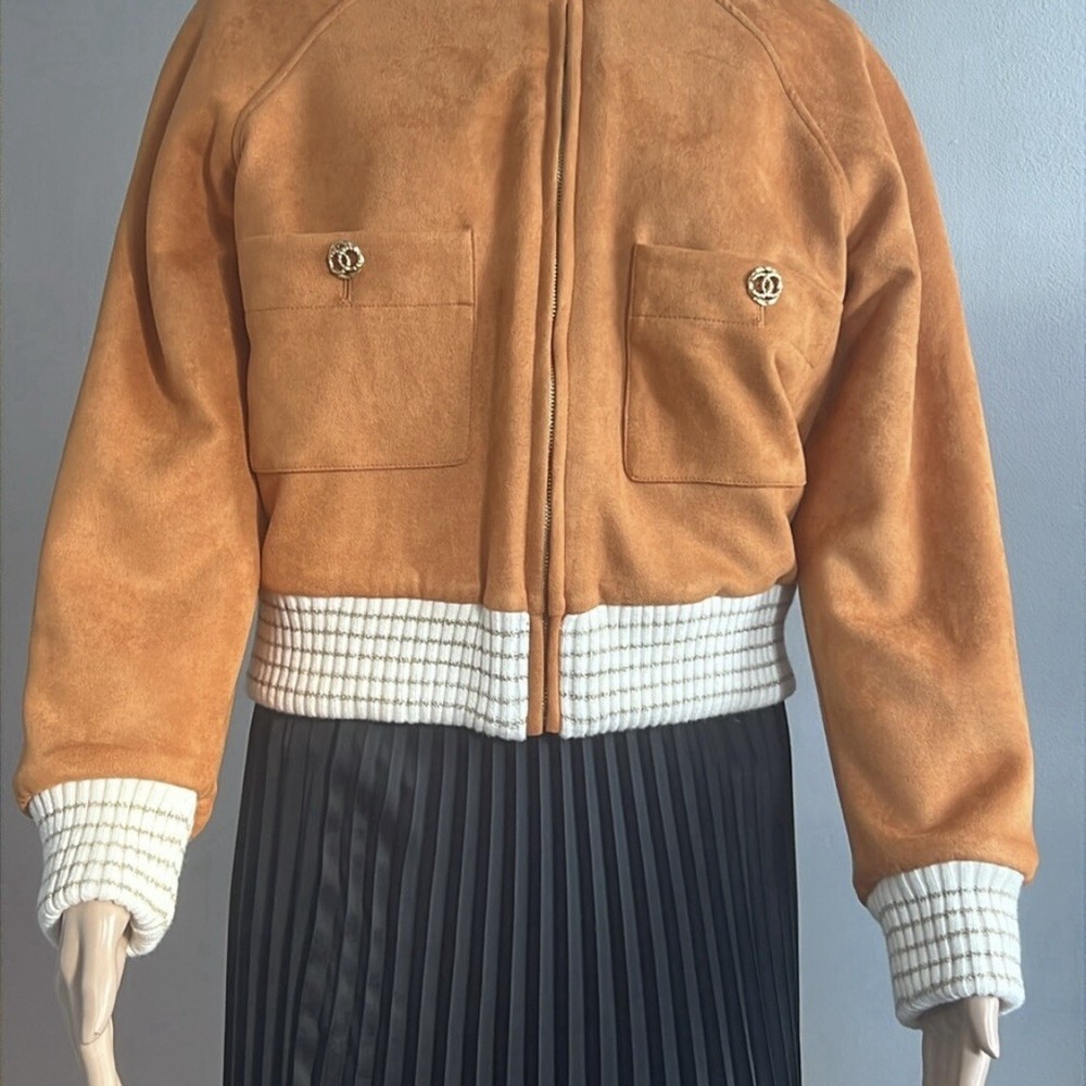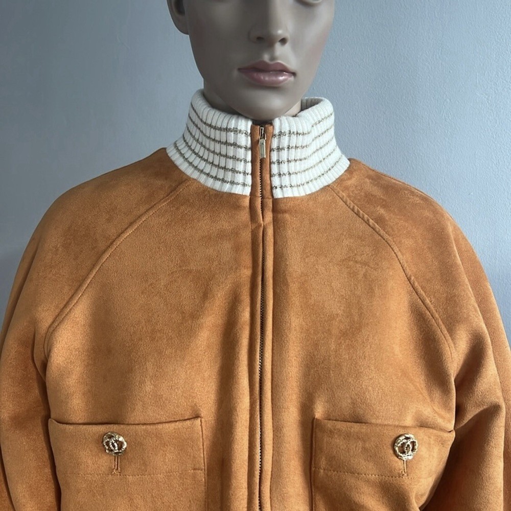 Shearling Suede Lambskin Camel Bomber Jacket Perfect condition! Size 36 USA Size 4 Approx measurements garment laying flat Pit to pit 19.5” Shoulder to hem 21” Sleeve measured from the pit 16.5” Main tag (that shows brand name) is missing. 70% lambswool 30% polyester Lining-100% polyester Made in France Color-Camel Front Full Zip closure Suede Pockets Faux fur lining Ribbed edges •No Returns No Holds No Trades