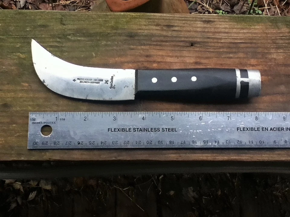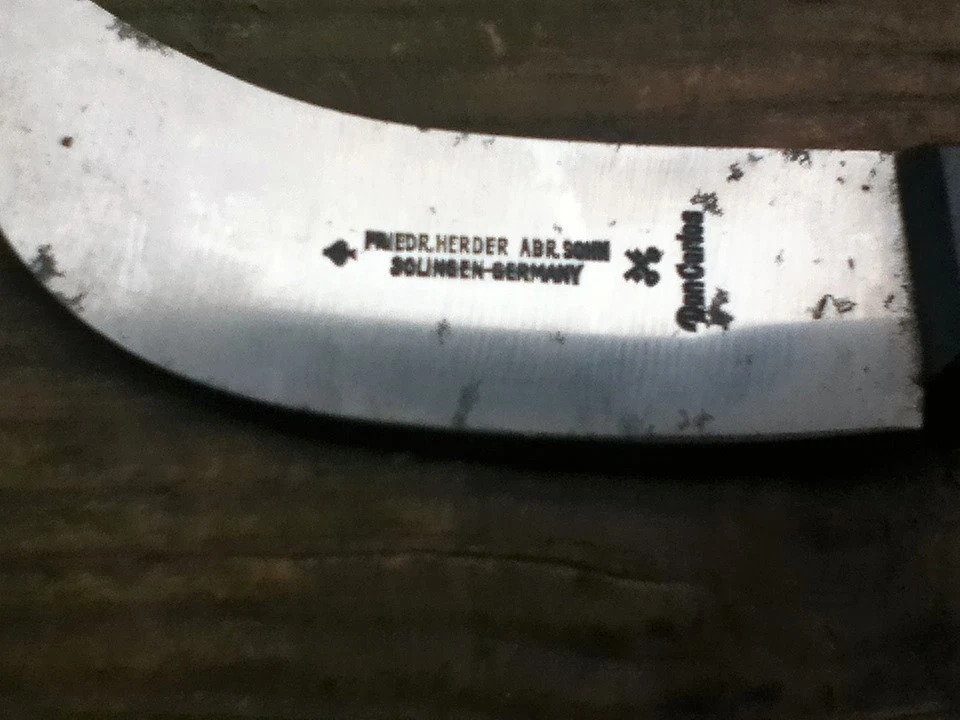 “Friedr Herder Abr Sohn” “Solingen Germany ” “Don Carlos” Knife is in good used shape for its age. Nice and tight. Blade also has a spade and crossed keys which must have been part of there trademark. Knife is marked as you see above in title. Measures 8” overall. No sheath,