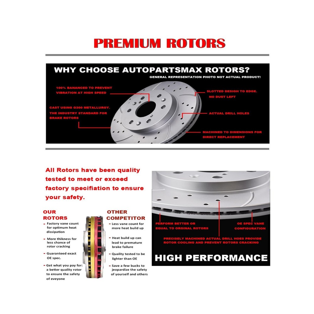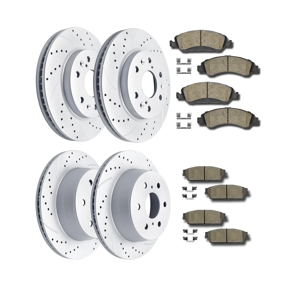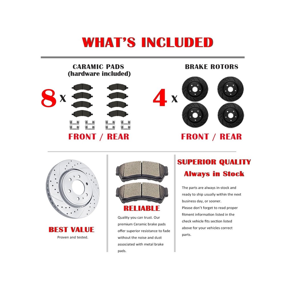 Front and Rear Drilled and Slotted Brake Rotors Ceramic Brake Pads Brake Kit Suitable for Cadillac Escalade GMC Yukon Chevy Silverado 1500 Tahoe Description Features: Notice: Note-Please read the description and compatibility chart before you place an order Includes: 2x Front Drilled & Slotted Disc Brake Rotors(Diameter 12.99 inch, 330mm)- 55097; 4x Front Ceramic Brake Pads (Hardware Included) - D1363; 2x Rear Drilled & Slotted Disc Brake Rotors(Diameter 13.58 inch, 345mm)- 55133; 4x Rear Ceramic Brake Pads (Hardware Included) - D1194 Performance Improvement: The brake discs rotors use drilling and slotting technology, which can not only enhance the dust exhaust function, but also improve the heat dissipation performance and keep stable in braking Ceramic Formula: The brake pads use ceramic formula, which is clean, and no noise during braking Note: We recommend that installation be carried out by professional technicians to ensure safety, and regularly check the status of brake rotors and pads to ensure replace them timely if needed Product Details: Brand: Acinoparts Vehicle Service Type: Car Year: 2018 Assembly Required: No Manufacturer: Acinoparts Brand: Acinoparts Vehicle Service Type: Car Year: 2018 Assembly Required: No Manufacturer: Acinoparts UPC: 726980944140 Model: Brake Kit Item Weight: 104.7 pounds Item model number: ABK00202 Exterior: Antiox Full Coating-Rust Proof and No Need Clean Manufacturer Part Number: ABK00202 Date First Available: August 31, 2021 Delivery We Do Not Ship Outside of the Continental US. Return Policy All items qualify for returns within 30 days of receipt. Seller is responsible for return shipping on any item that is not damaged. Feedback We take our reputation seriously, we buy and sell online, so we understand the value of trust. If you are unsatisfied with your order, please contact us and we will work with you to resolve it to your satisfaction.