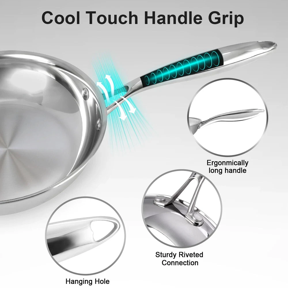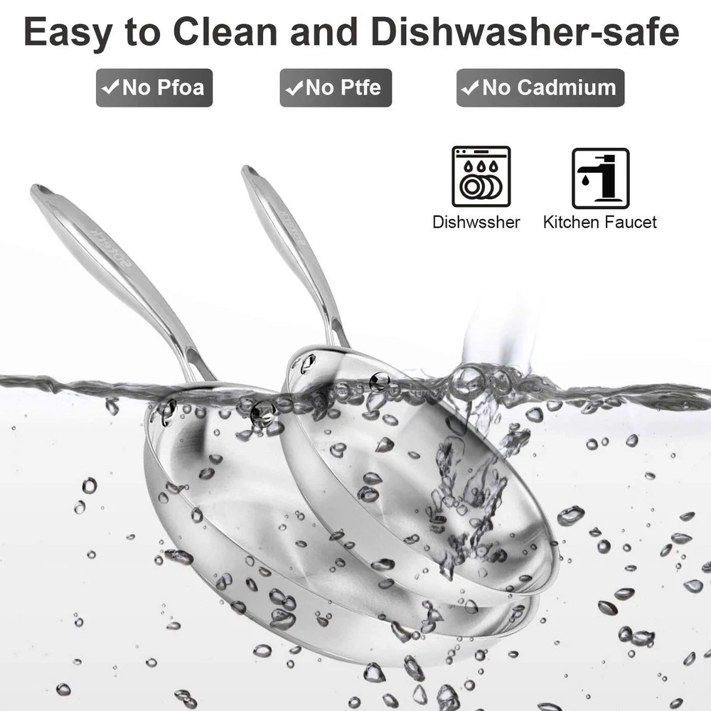 Fry pan set is suitable for gas, , rings, halogen cooktops, glass ceramic and induction, even it's oven safe to 500°F—perfect for the most seasoned cooks. This stainless steel skillet can be used for frying, sauté, deep-fried, cook and braise. Tri-ply fry pan cookware set of 8 inch & 10 inch fry pan. Tri-ply Construction - 304 food stainless steel interior cooking surface does not discolor, react with food or alter flavors. Middle made of 1050 pure aluminium ensure heats quickly and spreads heat evenly, eliminates hot spots. 430 magnetic stainless steel exterior effective for variety of cookers, multi-purpose. stainless steel frying pans has no coating-reducing soot, and environmental protection. It's durable, easy to clean, add water or detergent, wipe the inside and outside with the steel ball, or scouring pad, and then wipe it with a dry cloth. Also dishwasher safe. Well made features - The stainless steel rivets fix the handles-safe and durable, hollow handle design is both comfortable to hold and stays cool on the stovetop. In addition, the cooking pan comes with a handy hole in the handles, so you can easily hang them on your rack. Stainless steel sauté pan No Free of PFOA, PTFE, CADMIUM chemicals. Rest assured to use, 24-hour online after-sales support service. Any question, please feel free let me know. Your satisfaction is our forever pursue.