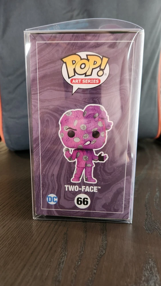 This Funko POP vinyl figure features the iconic characters of Batman and Two-Face from The Batman movie. The figure stands at 6.5 inches tall and is part of the DC Comics Series 1 collection. It comes with a hard case and is an exclusive item from Target.The purple figure is made of vinyl material and has a weight of 1.260 lbs. It is graded a 100 by Action Figure Authority (AFA) and is gender neutral. The Funko POP is a vintage item and is part of the Art Series collection. It has features that make it exclusive and is perfect for collectors of collectible figures and bobbleheads.