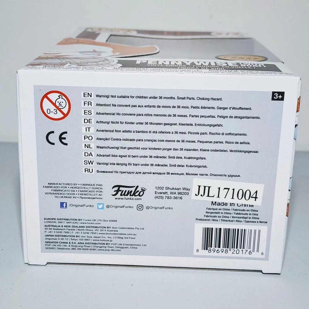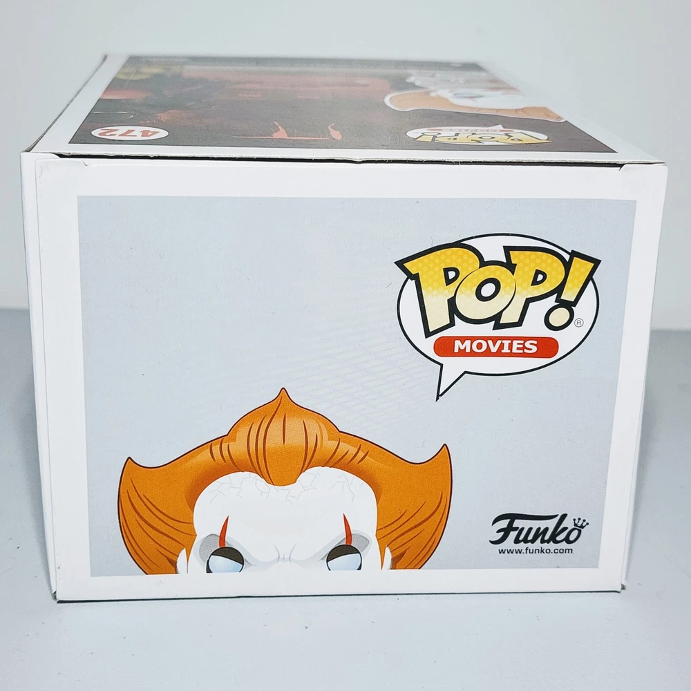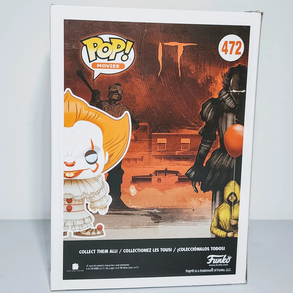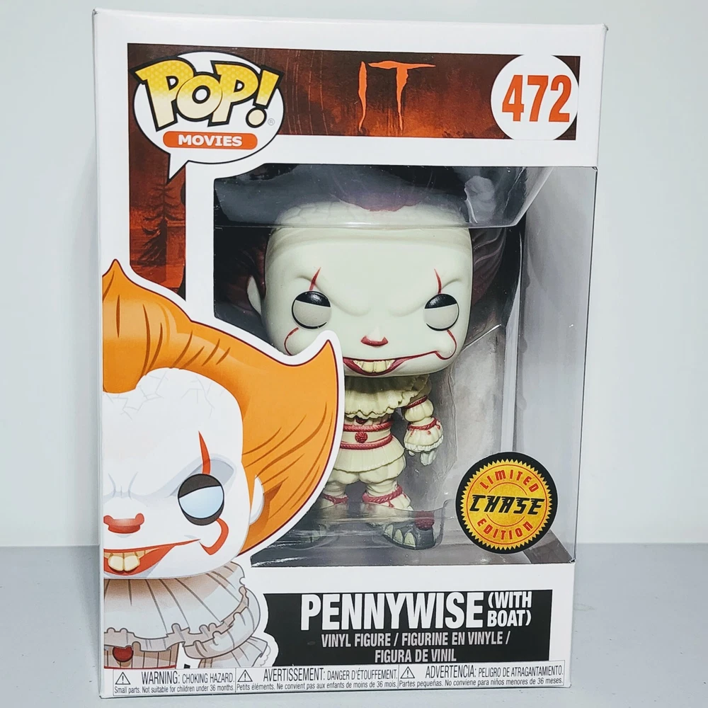 This Funko Pop Movies figure features Pennywise from the horror movie It, sitting in a boat. This exclusive Chase Edition vinyl figure is from the It (2017) S1 series and comes in box number 472. The packaging is damaged but the figure is protected by a protector. The Pennywise figure is part of the Funko Pop! collection and is made of high-quality vinyl material. It is a must-have for any It or horror movie fan. Add this unique and rare figure to your collection today!