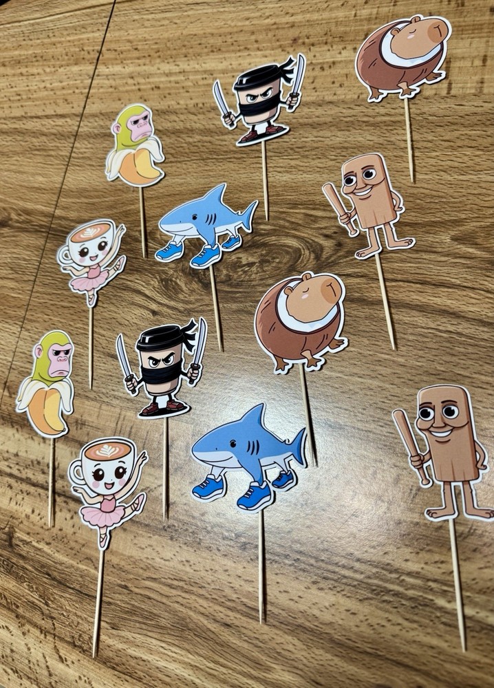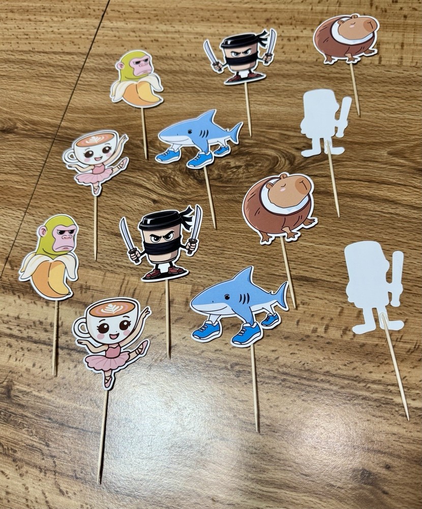 These Funny Animals Brain Rots Cupcake Toppers are a whimsical and playful addition to any party or celebration. Made of photo paper with a multicolor design, these small cupcake toppers feature animal shapes and a playful "Brain Rots" character theme. Perfect for all occasions, these handmade toppers come in a set of 12 and are sure to add a fun and unique touch to your cupcakes. Whether you're looking to decorate for a birthday, anniversary, or just add some fun to your desserts, these cupcake toppers are a fun and creative choice.