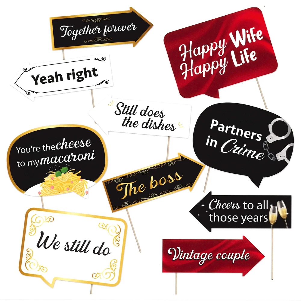 Description Funny Wedding Anniversary Photo Booth Props - Anniversary Party Decorations. π Anniversary Wedding Photo Booth Props - Offer 10 arrow and speech bubble photo booth props, along with 10 sticks and adhesives required for easy assembly. Photo Booth Props Wedding Anniversary Kit ensures a complete and immersive photo booth experience during your celebration. With the Wedding Anniversary Photo Props, you can create beautiful and heartwarming moments that will be cherished for years to come. π Ready-to-Assemble - Uncertain about the assembly process? Simply scroll down for detailed instructions on how to assemble the props. With the included glue dots and clear stickers, assembling the Photo Booth Props for Wedding Anniversary is quick and easy. Simply attach the sticks to the props using the adhesive materials provided, ensuring a secure and long-lasting setup. The user-friendly assembly process saves you time and effort, allowing you to focus on enjoying the event. π Diverse Prop Selection - Photo Props Wedding Anniversary offer a diverse range of options, including anniversary-themed props in different designs. This variety allows you to capture precious moments and create memorable photos during your party. Wedding Anniversary Photo Props add a touch of elegance to your pictures, creating a unique theme and capturing the joy and excitement of the occasion. π High-Quality Materials - Wedding Anniversary Props are professionally printed on thick cardstock paper. Wedding Anniversary Props for Photo Booth will arrive cut out and ready to assemble with the included 12β sticks and adhesives. The Photo Booth Anniversary Props are designed and manufactured in the USA, incorporating a combination of U.S. and imported parts. π± Eco-Friendly Choice - By using sticks instead of traditional wood sticks, the Photo Booth Props Anniversary Wedding provide an eco-friendly alternative. This choice demonstrates a commitment to sustainability and helps in the preservation of our forests. When you choose our Wedding Anniversary Photo Booth Props Printable, you are supporting environmentally conscious options.