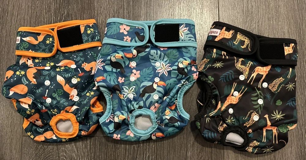 Keep your furry friend clean and comfortable with Fuz Bigaza's reusable dog diapers. This pack of three diapers in size L features a cute giraffe, tucan, and fox pattern that will make your dog stand out from the pack. The diapers are perfect for both male and female dogs and are designed to fit snugly and leak-free. Made by a trusted brand in pet supplies, these diapers are a great addition to any pet owner's kit. They are easy to wash and reuse, making them a practical and eco-friendly option for your pet. Say goodbye to messy and expensive disposable diapers and switch to Fuz Bigaza's reusable dog diapers today.