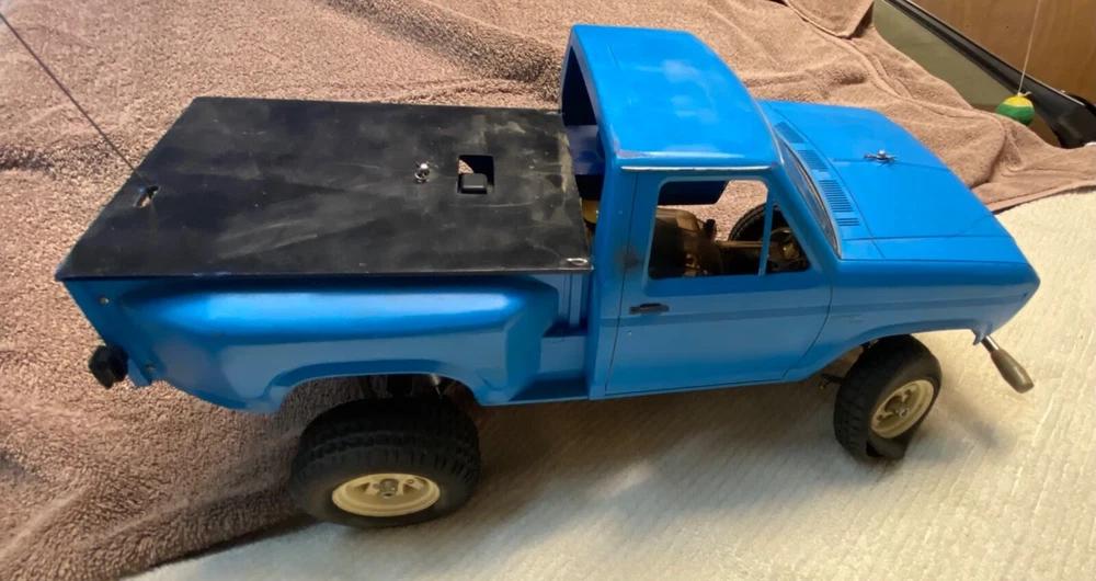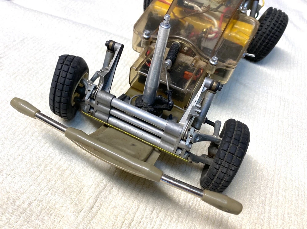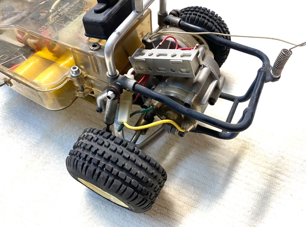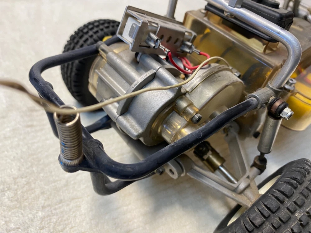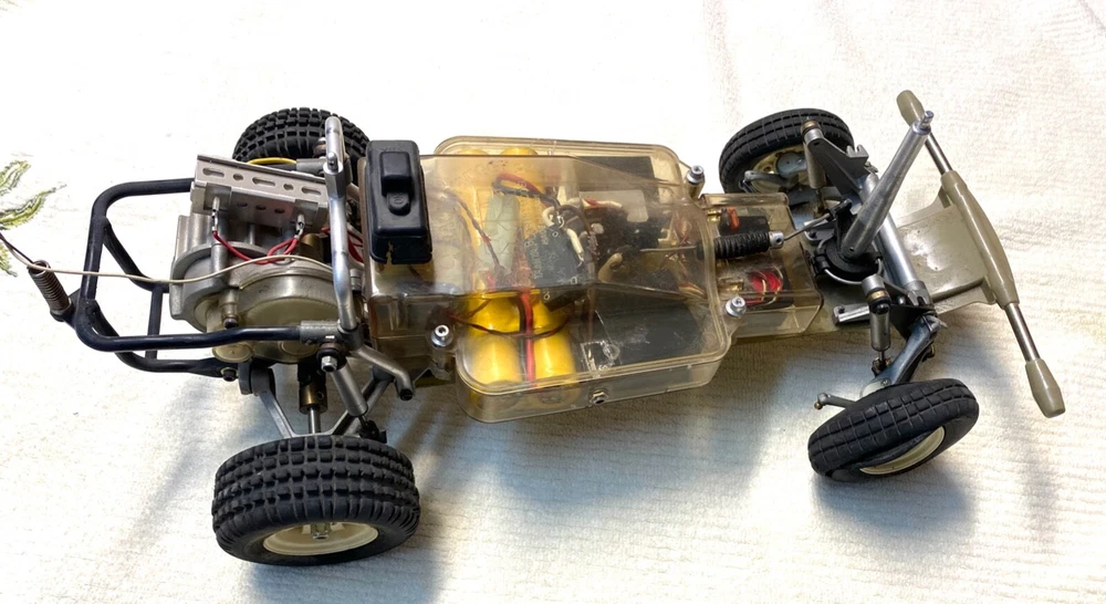 This vintage Tamiya 1/10 R/C off-road racer is a must-have for any collector or hobbyist. With its blue color and Ford truck replica, this model is a rare find. The recommended surface for this hobby grade model is off-road, and it runs on electric battery. The Tamiya brand is known for its high-quality plastic models, and this one is no exception. At a scale of 1:10, this model is perfect for display or play. It's a great addition to any collection and is sure to impress. Don't miss out on the chance to own this unique piece of RC model vehicle history. TAMIYA Racing Buggy Rough Rider vintage rare. Does not have original body, All original suspension, complete with Futuba receiver and servos. Does not include radio. This is from the 80's. Its been in my closet for years, was a functioning unit but I have not tested anything as I don't have the charger or radio. Sold as is due to not being able to test. Very Good condition for its age. Review the pictures, this has had very little use. Has original plastic housing for the battery and radio electronics which is somewhat rare. Passenger side front tire is dry rotted and a tie rod is missing for that same wheel, see pictures. Ford truck body is very rough condition, there are some pieces missing and there are some cracks. It really the chassis that is in like new condition. Let me know if you have any questions.
