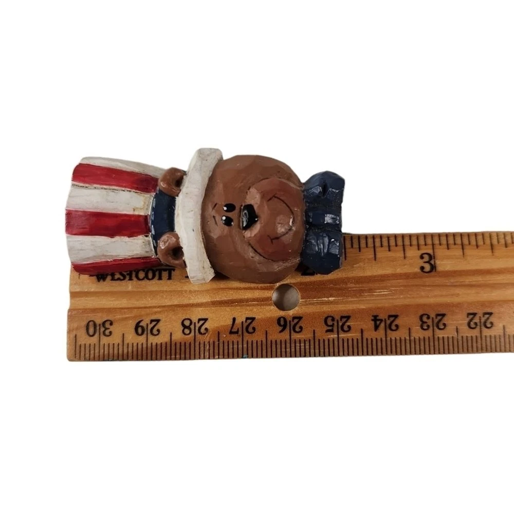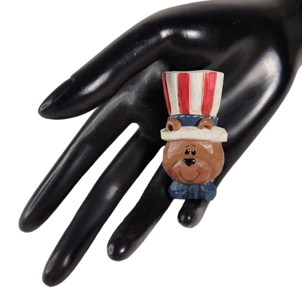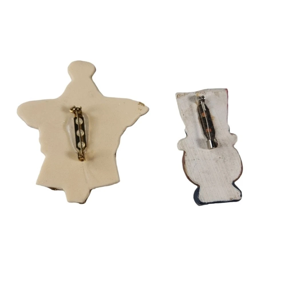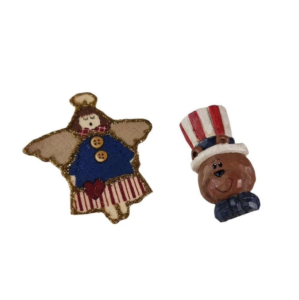 This set includes 2 rustic, country style pins. One is a resin, Uncle Sam bear, made to look like carved wood. The other is a decorated foam brooch. Both are in good condition, no issues