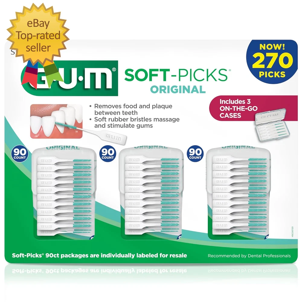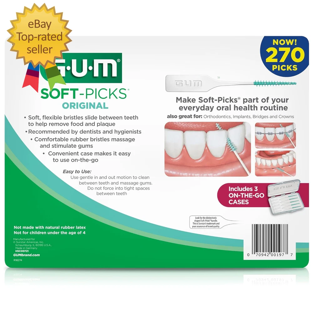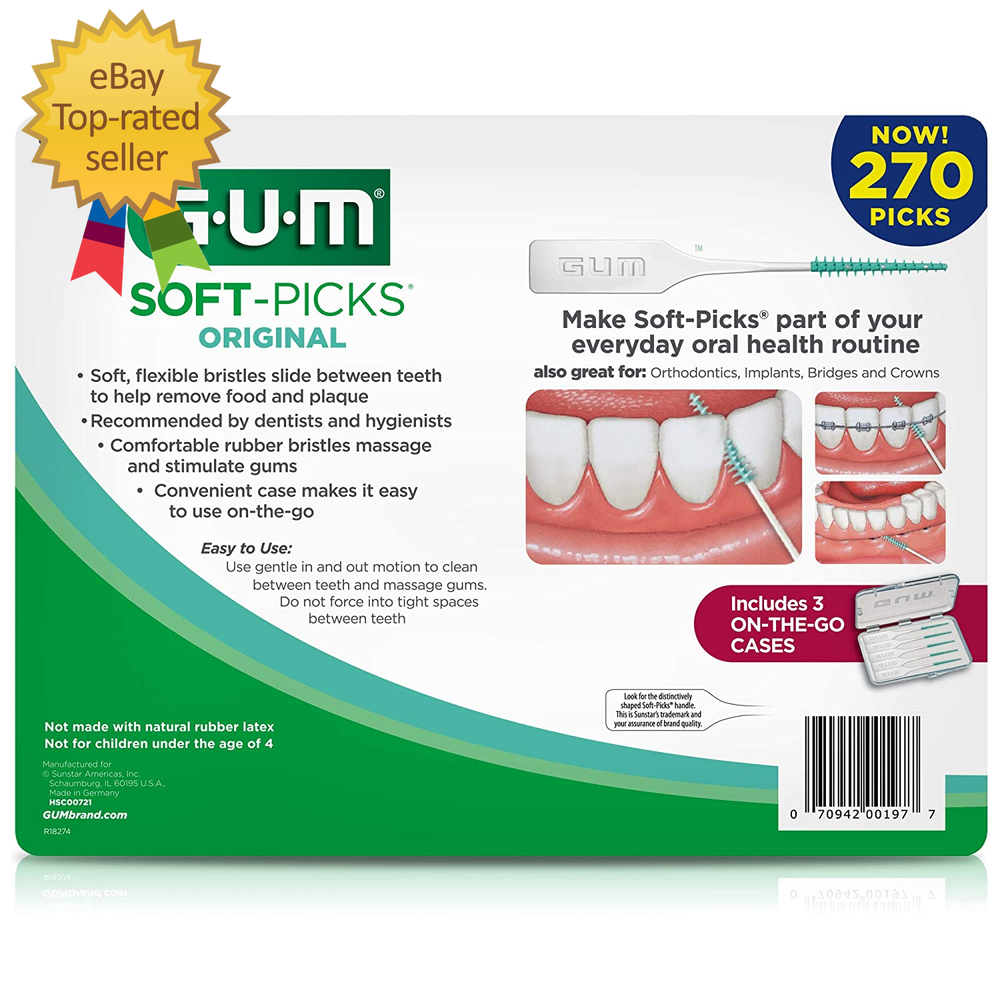 Store New Arrivals Add to Favorite View Feedback Contact GUM Soft-Picks Original Dental Picks, 270 Count Description Item model number 6325A Style Original Product Dimensions 11 x 8 x 2 inches; 3.2 ounces Country of Origin USA Department Unisex-Adult Is Discontinued By Manufacturer No Size 270 Count (Pack of 1) EASY & EFFECTIVE : Give yourself something to smile about with GUM Soft Picks Original. Our disposable tooth picks have soft bristles that slide easily between teeth to remove plaque and food for healthier gums, cleaner teeth, and fresher breath. ORIGINAL SOFT-PICKS : Perfect alternative to flossing. They’re particularly useful for cleaning between the front teeth and are a great choice if you have small interdental spaces, braces, bridges, or orthodontic appliances. DENTIST RECOMMENDED : Our dental floss picks are clinically designed by dental experts. Dentists and Dental Hygienists alike highly recommend them as a safe and effective way to remove plaque from hard-to-reach areas. GREAT FOR ON THE GO : Each dental pick set comes in a convenient plastic case that can be carried easily in your wallet, car, or handbag for a confident smile wherever you go. HEALTHY STARTS HERE : Research continues to show the connection between oral health and overall health. The GUM brand is committed to providing innovative care products for people of all ages to achieve their healthiest life possible. Going beyond brushing has never been easier. Meet GUM Original Soft Picks. The perfect portable interdental brushes for oral care on-the-go. Each of our dental picks feature ultra-soft, rubber bristles that gently & effectively remove plaque and food particles for cleaner teeth, healthier gums, and fresher breath. What sets Original Soft Picks apart? Super soft rubber bristles slide comfortably between teeth Tapered design adapts to different sized interdental spaces Safe for sensitive gums Latex, wood, and wire free Convenient plastic carry case Dentists and Hygienists alike recommend Soft Picks as an effective way to clean hard to reach areas in your mouth. Our Original style picks are especially well suited for food removal, cleaning of the front teeth, and teeth cleaning for those with small interdental spaces, braces, bridges, or orthodontic appliances. GUM Soft Picks make it easy to carry good oral care hygiene with you wherever you go. Each dental pick comes in a discreet size and is packed in a convenient plastic carrying case that fits easily into handbags, pockets, and glove boxes. Now that’s something to smile about! ABOUT US We offer the best prices around on high quality products. Our E-store includes media such as books, movies, music and games while offering electronics, toys, sporting apparel, clothing, tools, general home, garden items and more. SHIPPING We are always working hard to ensure your package arrives as soon as possible. Please understand that some factors like weather, high postal traffic, and the performance of shipping companies are outside of our control. We offer free shipping to the lower 48 states and ship within 2 business days of payment, usually sooner. We do not accept P.O. Boxes. Please provide a physical address. For shipping outside of the continental USA, we only use eBay's Global Shipping Program. The item is shipped to IL and then sent to the rest of the world. International customers are responsible for all duties and taxes. Continue to 'check out' to calculate costs for shipping the item to your country. Messages regarding eBay's Global Shipping Program MUST be directed at eBay EXCLUSIVELY. RETURNS We do not accept returns under normal circumstances. However, we will gladly consider a return if the item is received broken or if the wrong size is sent to you. In all other cases, returns will not be accepted. CUSTOMER SATISFACTION We try our very best to make sure every customer is completely satisfied. If there's a problem, message us! We're happy to help.