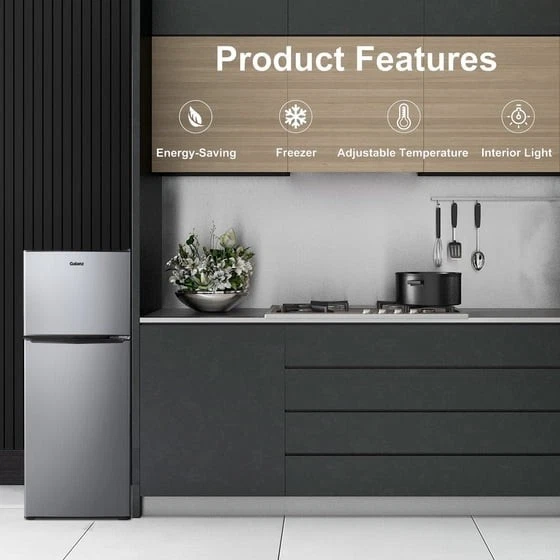 About this item Product details Enjoy the convenience of having your favorite chilled food, drinks or snacks whenever you want with the Galanz 4.6 cu ft 2 door mini fridge with stainless-steel look and top freezer. The Galanz 4.6 cu ft fridge will enrich your kitchen, rec room or home office with different styles. The Galanz 4.6 Cu ft 2 door mini fridge features an adjustable thermostat, separate freezer compartment, bright interior lighting, removable glass shelves and handy can dispensers. The convenient reversible doors allow you to choose to open from the left or right side making the Galanz 4.6 cu ft 2 door fridge suitable for any layout. Condition: New, Width: 19.13". Galanz 4.6 Cu ft Two Door Mini Fridge Energy Saving EStar True Top Freezer Interior Light 2 Liter bottle storage in door Adjustable removable shelves Adjustable Thermostat Can Dispenser Reversible Doors Condition: New Width: 19.13" More details Volume capacity 4.6 cu ft Number of doors 2 Defrost type Manual Energy consumption per year 325 kWh Number of shelves 4 Assembled product weight 70.55 lb Height 48.09 in Refrigerator type Compact Refrigerators Brand Galanz Refrigerator feature Energy Efficient, Freezer, Removable Shelves, Reversible Door Hinges Rec location Dorm, Indoor Accessories Removable Glass Shelves, 2 Liter bottle storage in door, User Manual Number of cans 12 Number of bottles 2 Freezer configuration Top Door Freezer Depth without door & handles 21.61 in Door color Stainless Steel Shelf material Glass Product line Mini Fridge Door material Stainless Steel Minimum temperature 0 ºF Number of zones 2 Has written warranty No Installation type Freestanding Door style Standard Rec. use Residential Home decor style Modern Refrigerator depth Standard Depth Color category Silver, Black, Multicolor Model GL46TS5E Cord length 59 in Power type Corded Electric Volts 120 V Refrigerator dispenser type No Dispenser Ice maker type No Ice Maker Number of bins 0 Is smart N