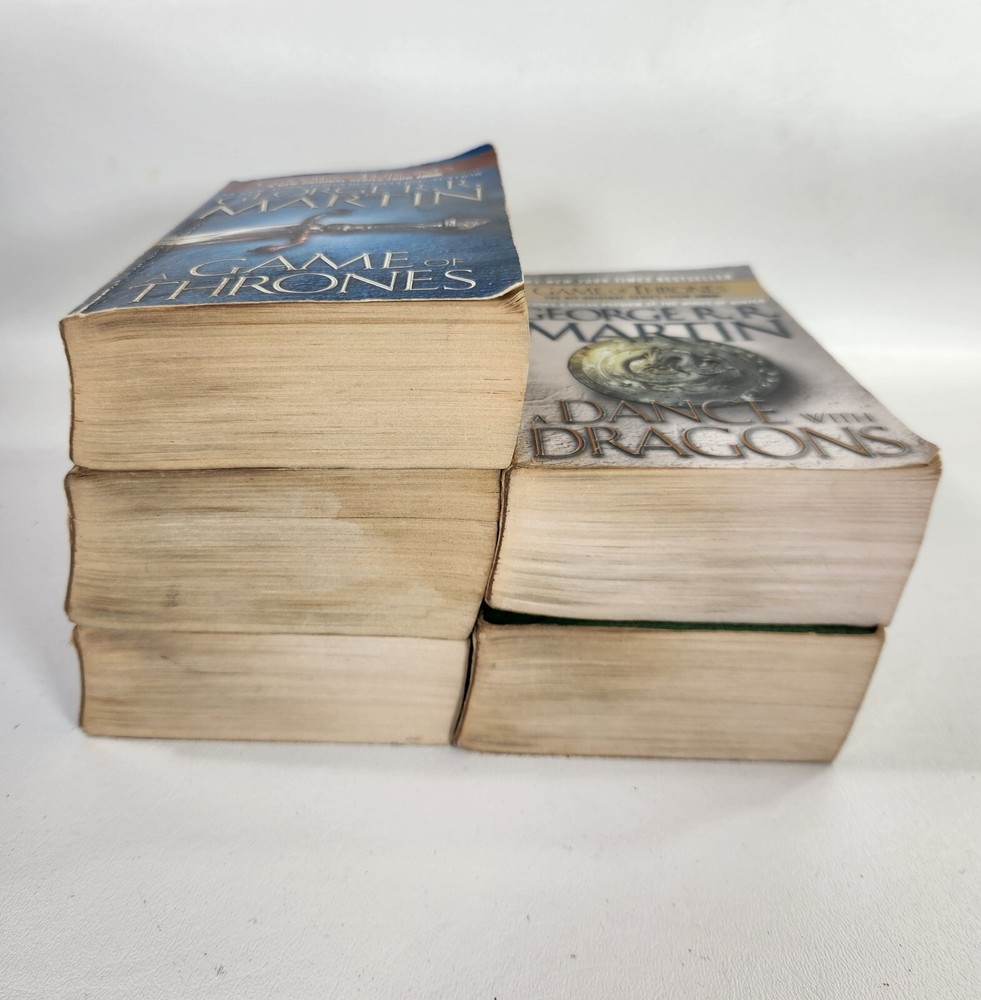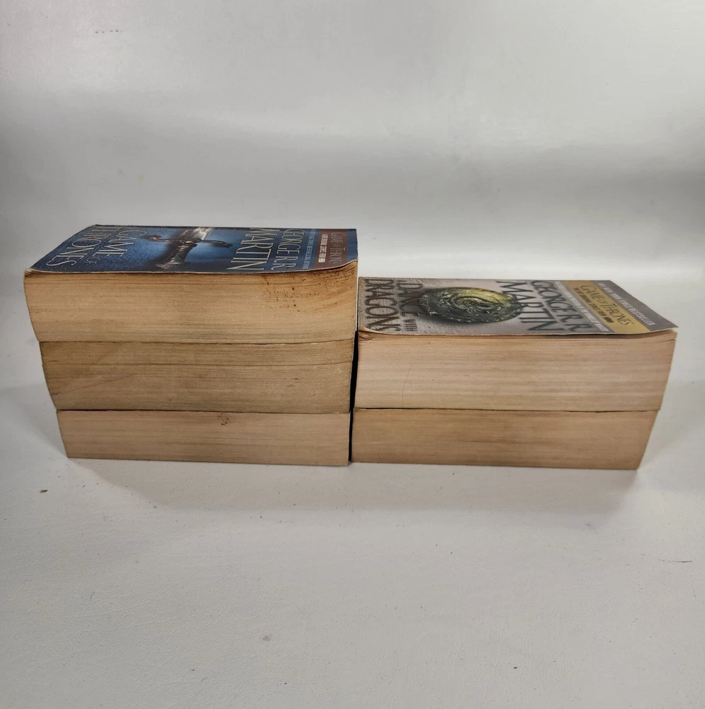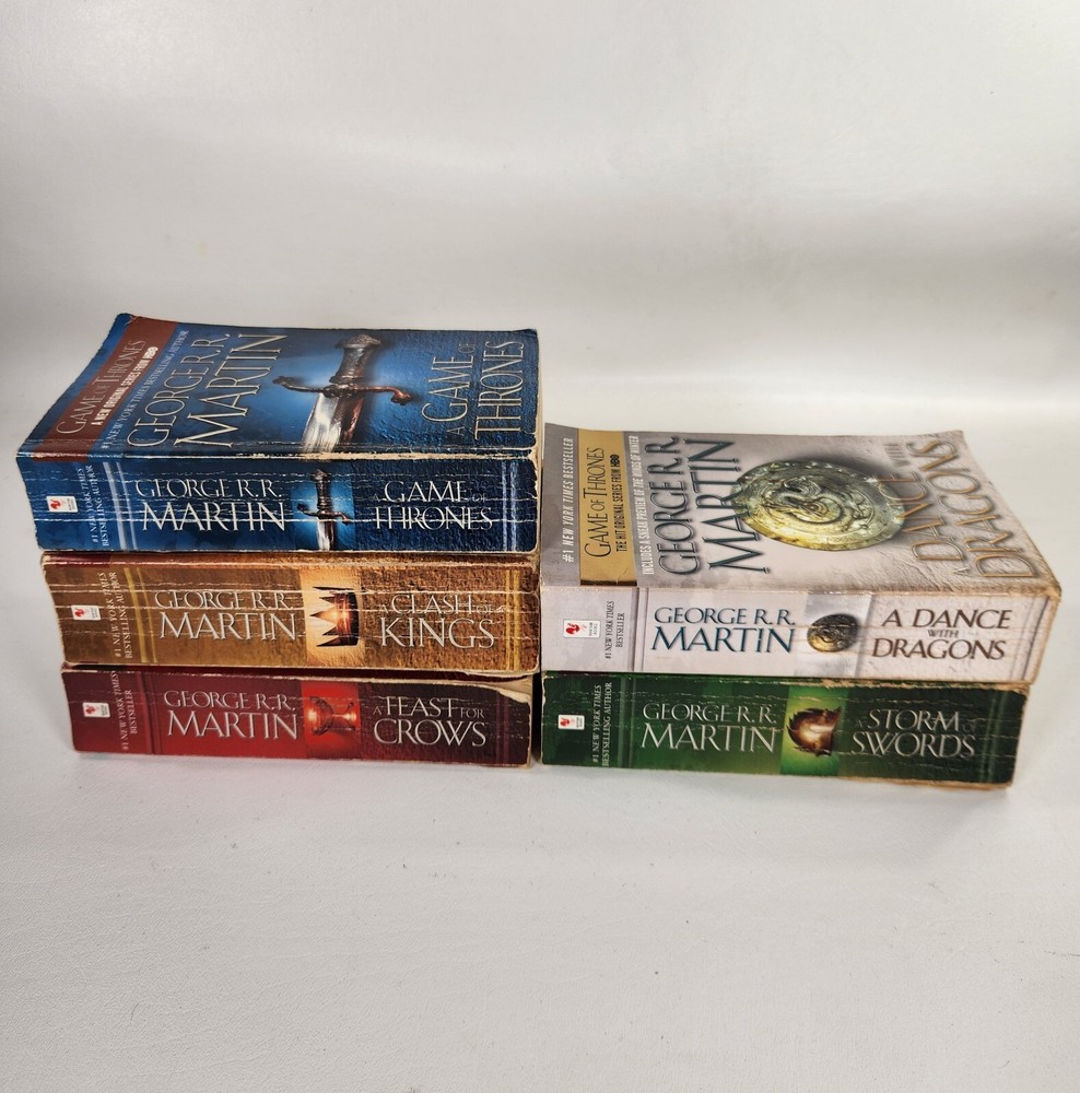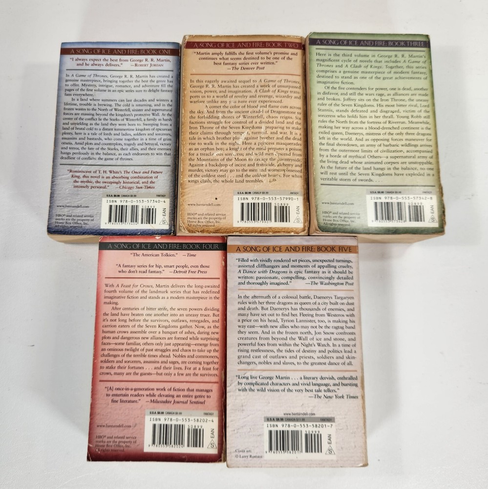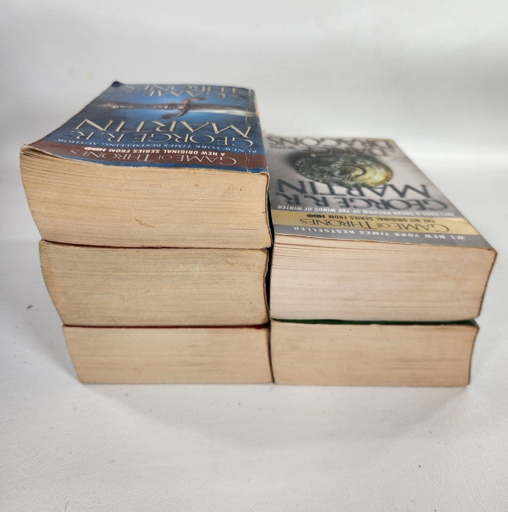 Immerse yourself in the captivating world of Westeros with this lot of 5 complete novels from the A Song of Ice and Fire series by George R.R. Martin. These novels, published by Bantam, are perfect for adults who enjoy fantasy, dragons, and magic. The books, written in English, are part of the Game of Thrones series and are set in a fictional world where dragons roam the land. The narrative type is fiction, and the intended audience is adults. The author, George R.R. Martin, is known for his masterful storytelling and has created a rich and detailed world that will keep you captivated for hours. This lot of books is perfect for anyone who loves the fantasy genre and is looking for an exciting and immersive read. 11A
