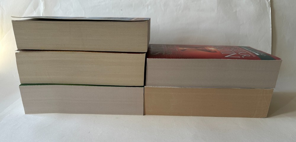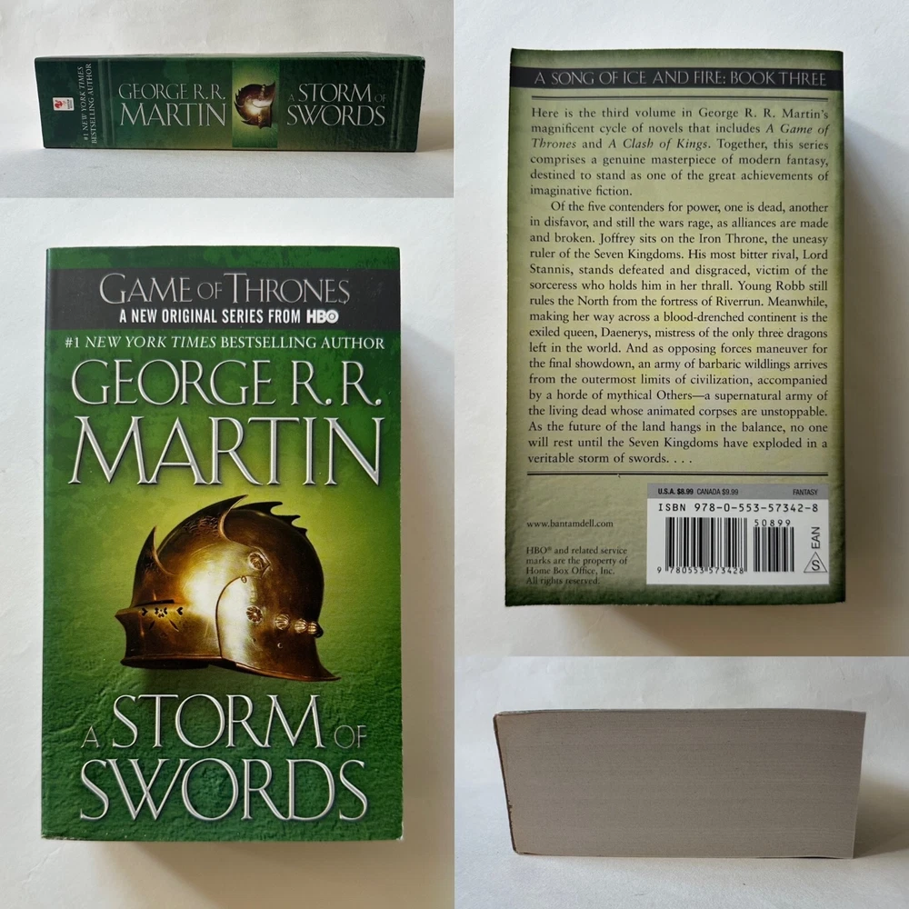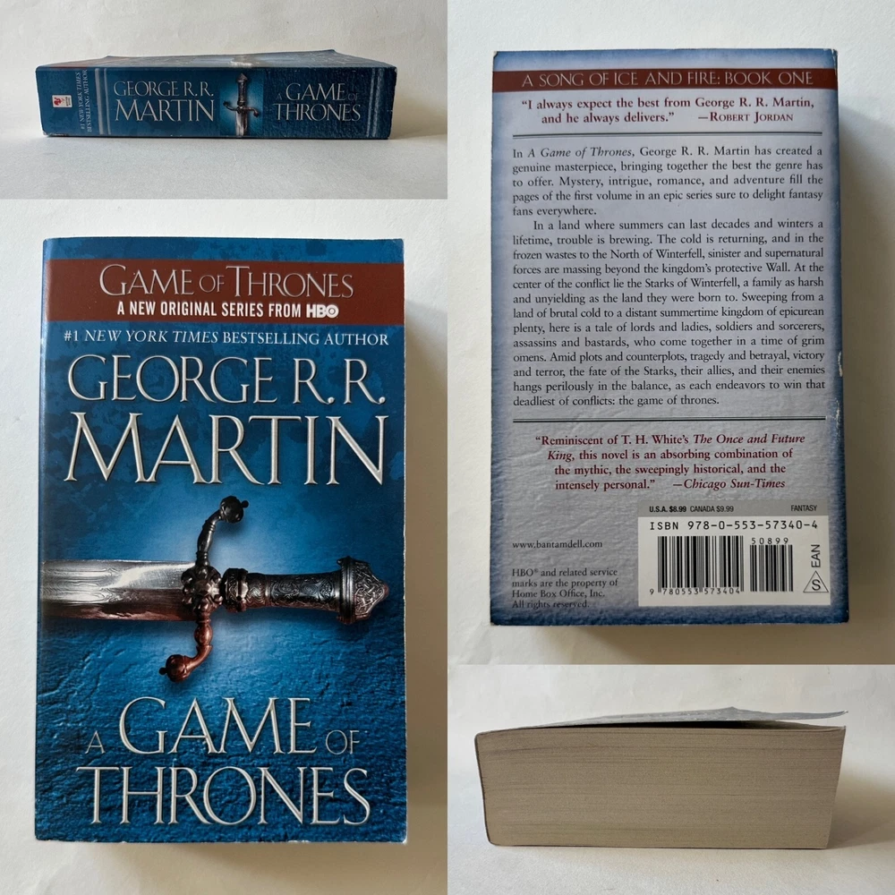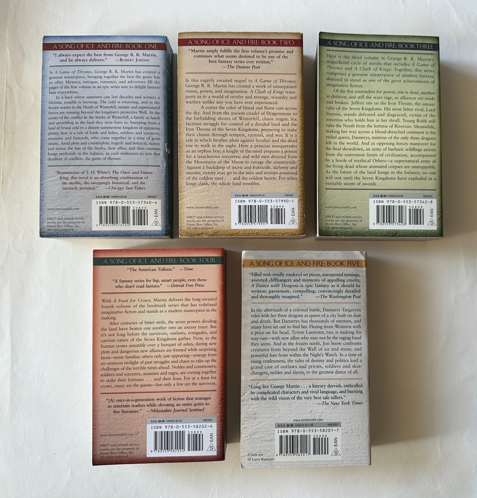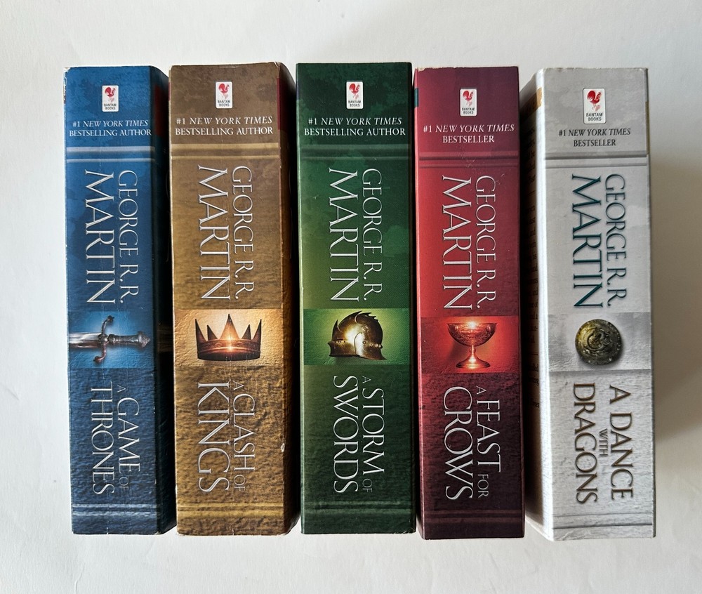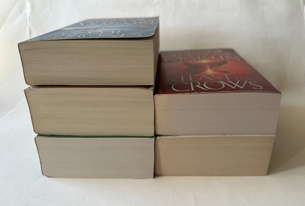 -- -- -- + + + -- -- -- Lot of five paperbacks by George R.R. Martin from the series A Song of Ice and Fire. This set is in great condition, with only some minor reading wear on a few titles. See below for details on book conditions. AUTHOR: George R.R. Martin SERIES TITLE: A Song of Ice and Fire - Books One to Five PUBLISHER: Bantam Books TITLES IN LOT: Title (Publication data) Grade , notes on condition. A Game of Thrones ( 2011 • ISBN: 9780553573404) VG- , some reading wear light creases on spine, minor edge wear. A Clash of Kings ( 2011 • ISBN: 9780553897852) VG- , s ome reading wear, light creases on spine, minor edge wear. A Storm of Swords ( 2011 • ISBN: 9780553573428) VG+ , m inimal signs of use. A Feast for Crows ( 2011 • ISBN: 9780553582024) VG+ , m inor edge wear. A Dance with Dragons ( 2013 • ISBN: 9780553582017) Good+ , s ome reading wear, minor rubbing along edges of cover, corners slightly curled. SHIPPING: Ships via USPS Media Mail, promptly and well protected, from Oakland, CA, using recycled packaging material whenever possible. Shipping charge is the actual postage paid on six pounds of books. ::::::: [ The PRINT 'N' PLATTER Guarantee ] ::::::: Even though I do my best to provide accurate photos, descriptions and gradings, I deal mostly with secondhand items. And no matter how much I try to avoid them, mistakes can occasionally happen - online selling is not an exact science. But I stand behind everything I sell. So if you feel I've missed the mark, left something out, misrepresented an item - or feel dissatisfied in any way - please get in touch and let me make it right. Any questions? Please ask! --- + --- + + + --- + ---