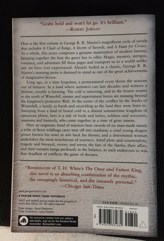 Publication Year:2002Item Length:9.2 inPublisher:Random House WorldsISBN:9780553381689Book Series:A Song of Ice and Fire Ser.Genre:FictionBook Title:Game of ThronesAuthor:George R.R. MartinItem Height:1.3 inFormat:Trade PaperbackNumber of Pages:720 Pagesgtin13:9780553381689Language:EnglishItem Width:6.1 inTopic:Science Fiction / Action & Adventure, Action & Adventure, Fantasy / EpicItem Weight:23.6 Oz