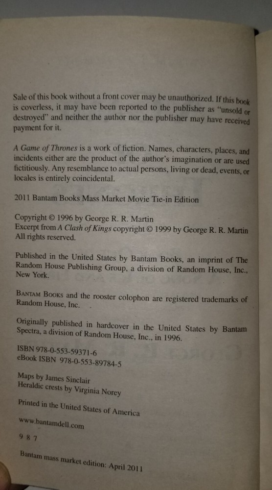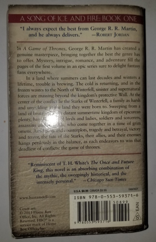 Book Title:Game of Thrones (Hbo Tie-In Edition)Book Series:A Song of Ice and Fire Ser.Genre:FictionIllustrator:YesItem Length:6.9 inItem Height:1.3 inNumber of Pages:864 PagesCountry/Region of Manufacture:United StatesIntended Audience:AdultsNarrative Type:FictionItem Weight:14 OzAuthor:George R.R. Martingtin13:9780553593716ISBN:9780553593716Item Width:4.1 inPublication Year:2011Original Language:EnglishTopic:Action & Adventure, Fantasy / Epic, Media Tie-InFormat:Mass MarketPublisher:Random House WorldsLanguage:English