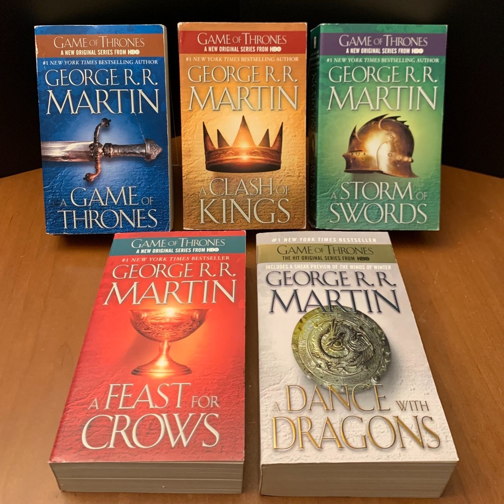 This paperback book lot includes: Game of Thrones A Clash of Kings A Storm of Swords A Feast for Crows A Dance with Dragons Each individual book varies in condition. Please see photos for details on book conditions. Shipping is free for carts of $50 or more, Please check out my other listings for more great books to save on shipping! I will always package your books safely in a cardboard box. I do not use mailers! If you have any questions regarding this lot, please feel free to contact me.