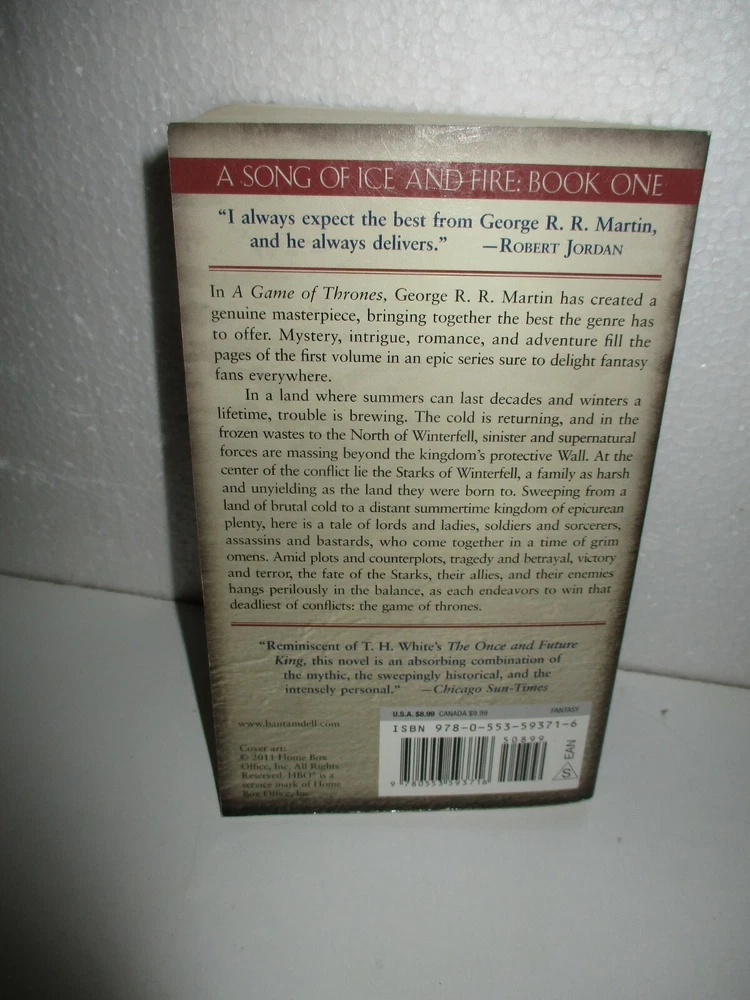 Tittle: A Song Of Ice And Fire - Game Of Thrones ISBN: 978-0-553-59371-6 / Author: George R. R. Martin Publisher: Bantam Books (2011, Paperback, measures approx. 6 7/8th" x 4 1.5/8th" x 1 3/8th" ) $ 8.99 US / $9.99 Canada (Fiction/Novel/Fantasy) Printed in USA Condition: Pre-owned. handling/shelf wear along the edges and corners, curling on corners, please look at the photos closely, they describe condition better than I could. Thanks USA Shipping: USPS: Approx. 1 lbs - 4 oz packed, with tracking International Shipping: Any Customs Duty/Tax/Fee is buyer's responsibility Combine Items: Items paid at the same time will be combined. Separate sales will be mailed separately for tracking purposes