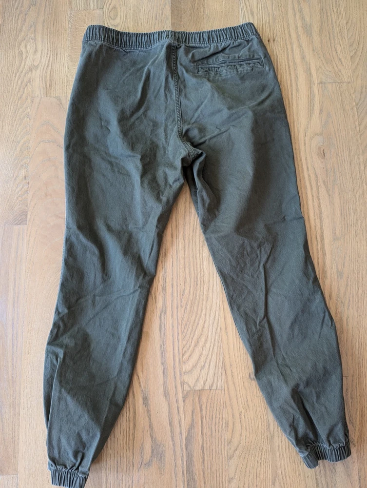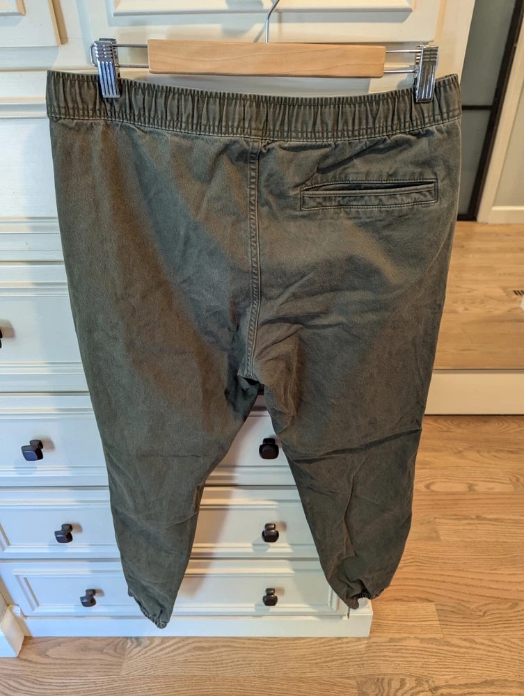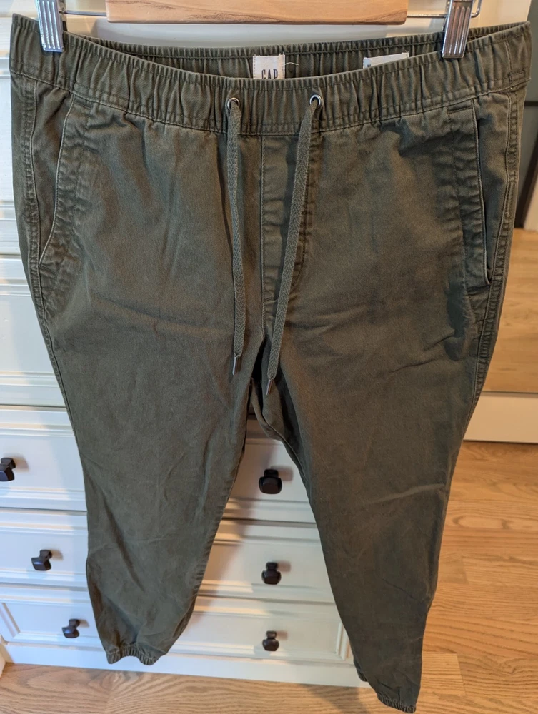 Good pre owned condition men's Gap Essentials Joggers in size Medium. Fabric is an olive colored twill. Ankles as re gathered, as shown in photos.