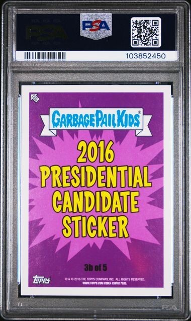 HI WELCOME to my STORE. Up for sale is a GARBAGE PAIL KIDS 2016 AMERICAN AS APPLE PIE- US PRESIDENTAL CANDIDATE STICKER #3b "TUMLTUOUS TRUMP". "PSA 9" Only 35 in population right now. In fresh just graded condition. New clean slab. In Super good shape. CHECK PICs. All graded cards will be new resealable bag for shipping. Plus packed well for safe travels. THANKS for looking.