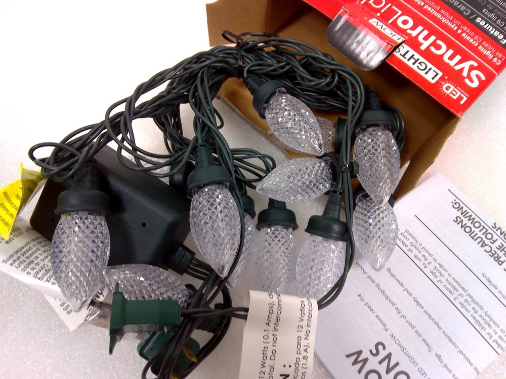 The Gemmy 12 Count LED LightShow Synchrolights C-9 String Christmas Lights are a festive decoration perfect for any holiday occasion. The C9 Lights create a synchronized show of color changing lights Connects end to end plugs These multicolor lights are designed in a C9 shape and can be used both indoors and outdoors. The string lights are electric-powered and feature LED lighting technology, providing a bright and vivid display. With a length of 11 feet and a green cord, these Gemmy string lights are a high-quality and durable option for adding holiday cheer to your home or garden. FREE SHIPPING!