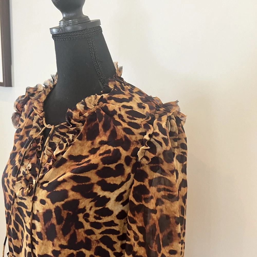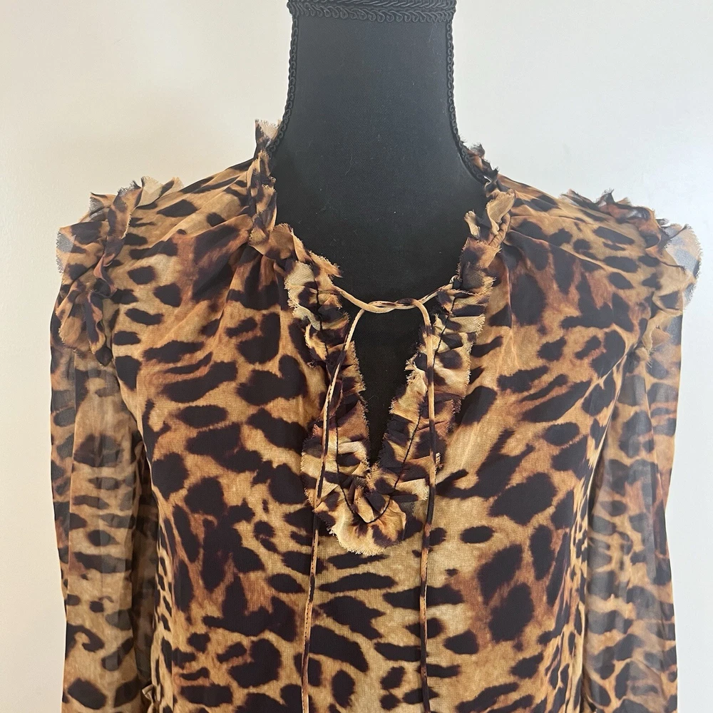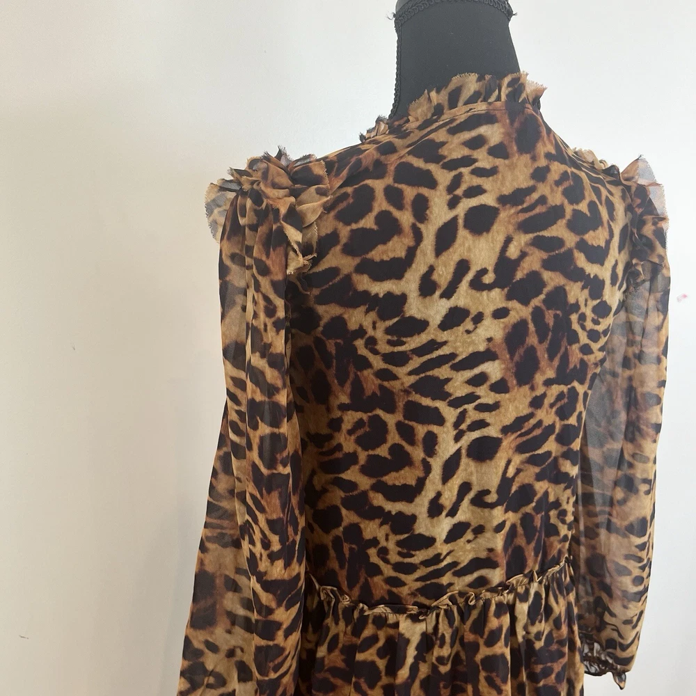 Generation Love Rumi Mini XS Brown Leopard Print separate Black Slip Lining Bust: 17" flat measure pit to pit Length: 34" shoulder to hem This Generation Love Rumi Mini Dress in XS size is perfect addition to your wardrobe. The dress features a beautiful brown leopard print and is made of high-quality polyester material with a chiffon fabric type. The 3/4 sleeves and V-neckline with string tie add a touch of elegance to the dress, while the pullover closure makes it easy to wear. The dress is lined and should be hand washed only. See photos. Ask questions. Thank you for supporting my small, woman owned business.