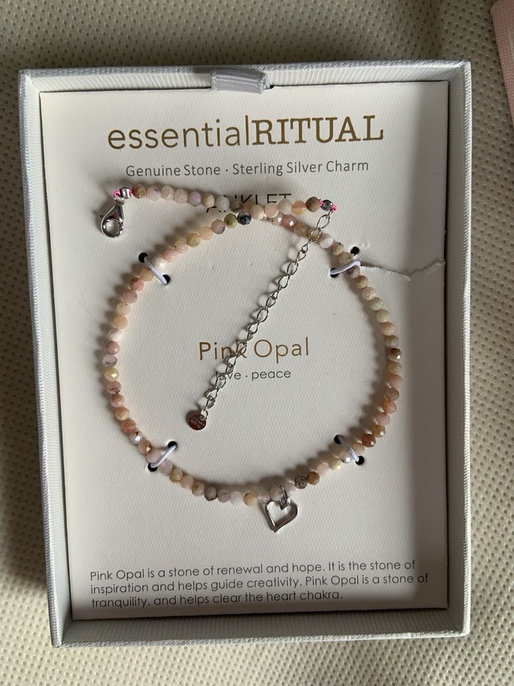 Sold as is. Anklet in perfect condition. Unused and new. Some minor damage to original BOX. Anklet type: Genuine Pink Opal This beautiful anklet features a genuine pink opal stone, adding a touch of elegance to your footwear collection. Perfect for those who appreciate the finer details in their accessories, this anklet is a must-have for any fashion-forward individual looking to add a subtle sparkle to their steps. Crafted with care, this anklet is designed to complement a variety of styles, whether you're dressing up for a special occasion or just accenting your everyday wear. The delicate pink hue of the opal stone is sure to charm and will effortlessly enhance the look of any outfit.