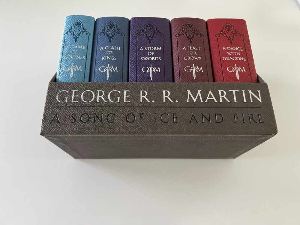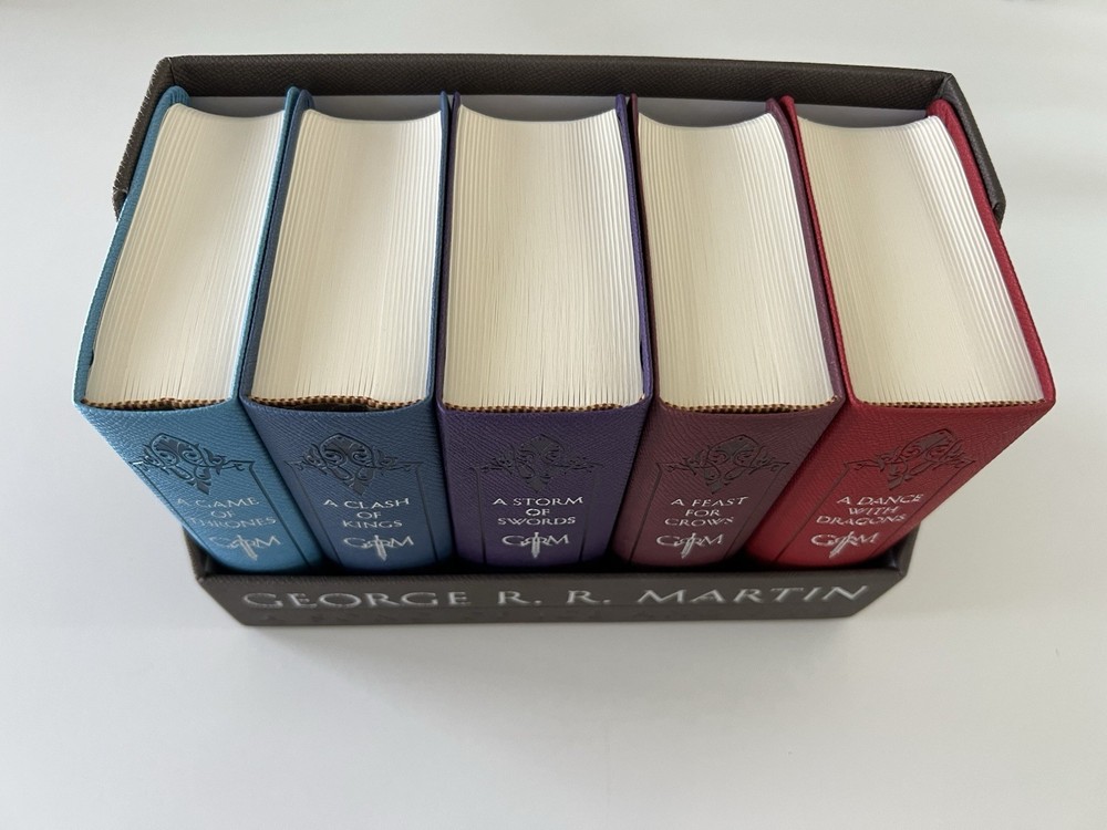 A Song of Ice and Fire Set of 5 Leather Bound Books George R.R. Martin This Boxed Set of 5 Leather Bound Books is in excellent condition. Books have never been read. This boxed set includes: A Game of Thrones A Clash of Kings A Storm of Swords A Feast for Crows A Dance with Dragons Items come from a smoke-free home. Feel free to ask if you have any questions. Thanks for looking and please check out my other auctions!