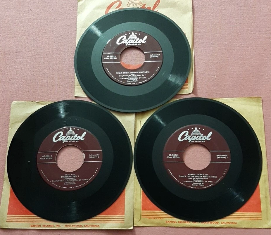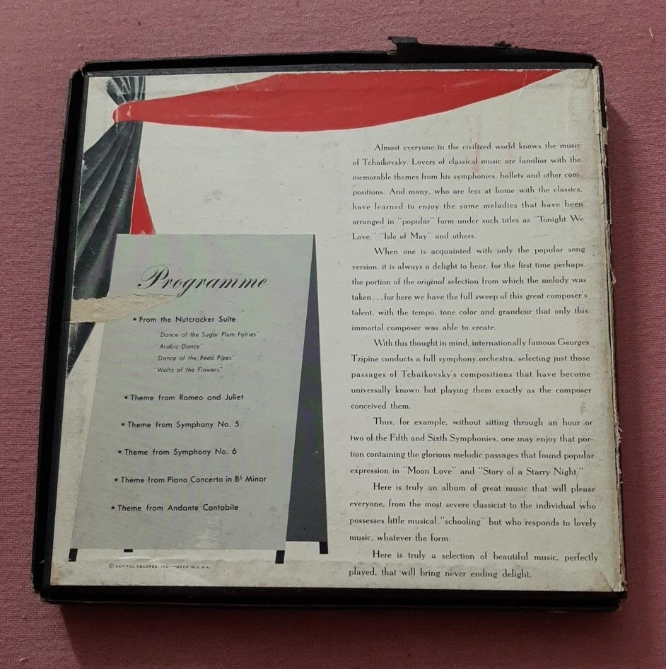 Georges Tzipine Familiar Themes From Tchaikovsky 3 45 box set Capitol KCF 251. Vinyl is in overall solid very good to very good plus condition with quite a few minor light scratches and marks, some gloss. Box is in very good condition with splits, tears, surface dirt, fading and wear, the top starting to come separate from the bottom.