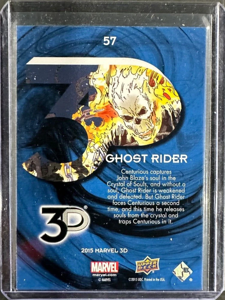 This Ghost Rider 2015 Marvel 3D Upper Deck trading card #57 is a must-have for any superhero and comics fan. Made of high-quality card stock material, this non-sport trading card features a stunning 3D design that brings the character to life. Manufactured by Upper Deck in the United States, this original card is part of the Marvel 3D set. The card is in standard size and showcases the iconic Ghost Rider franchise. It is perfect for collectors and fans of the Marvel Cinematic Universe. Add this unique piece to your collection today.