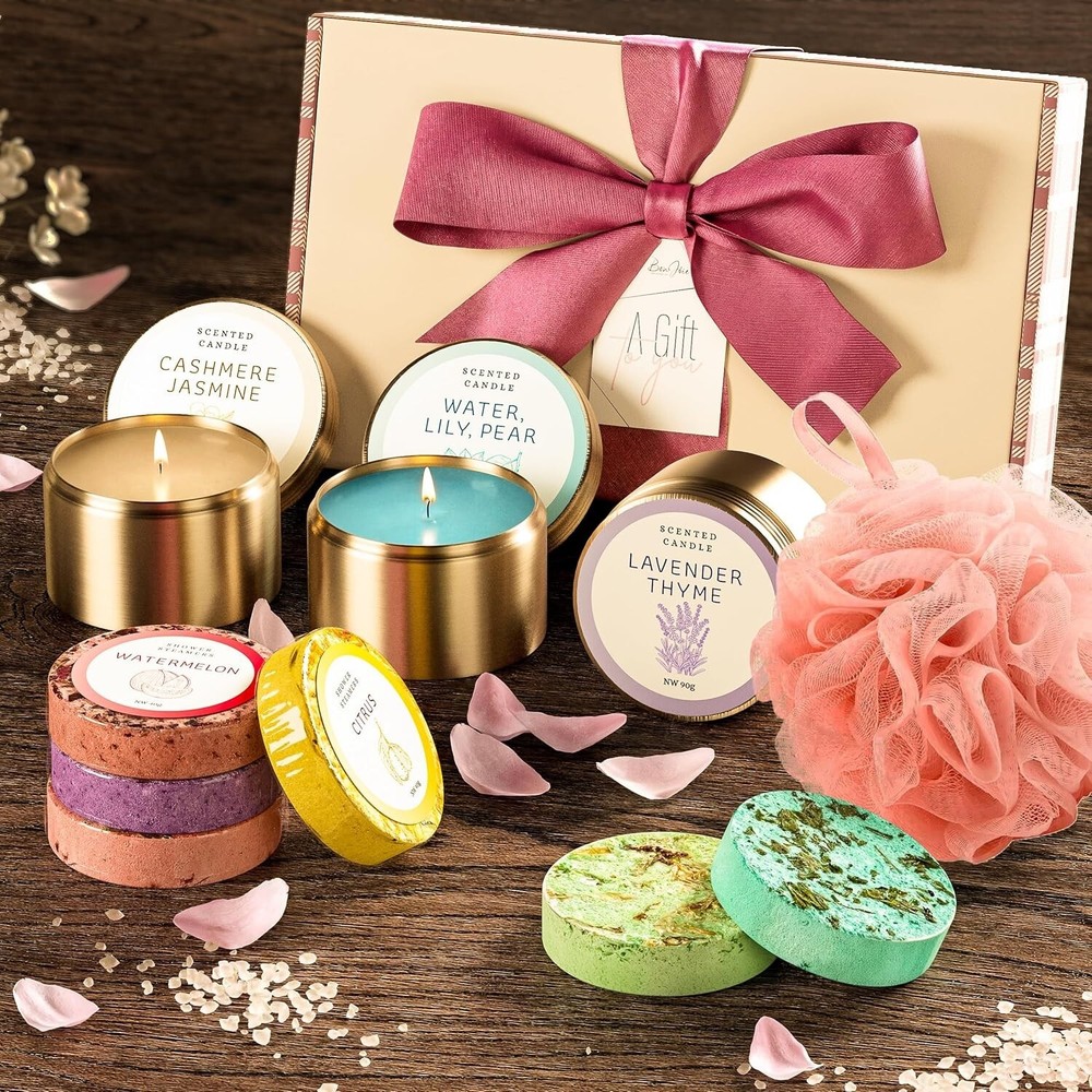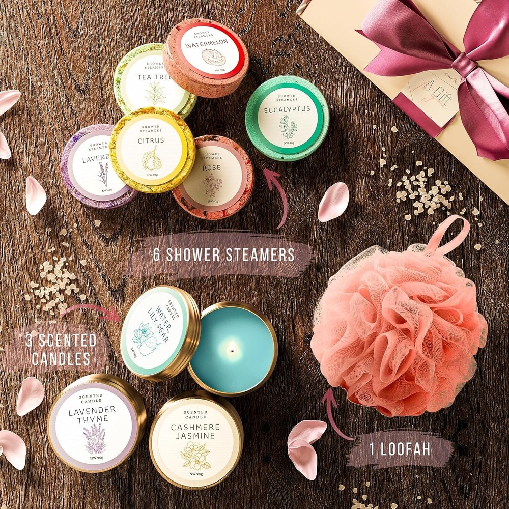 About this item BEAUTIFUL COMPLETE SHOWER STEAMER GIFT SET: This luxurious set includes 6 shower steamers in soothing scents like lavender, citrus, eucalyptus, tea tree, watermelon, and rose. It also features 3 scented candles—lavender thyme, cashmere jasmine, and pear lily water—and 1 shower loofah, providing everything you need for an at-home spa experience. Perfect as gifts for women, this shower steamers aromatherapy set is an ideal choice for unique gifts for women who deserve a little self-care. BEAUTIFULLY PACKAGED AND READY TO GIFT: This shower steamer & candles for women set comes elegantly packaged, taking the hassle out of gift shopping. With its exquisite appearance, it’s perfect for any occasion, making it the best gifts. Whether you’re looking for candle sets for women gift, women stocking stuffers, or self care gifts for women, this set adds a touch of luxury to your relaxation gifts. A thoughtful choice for anyone who loves shower accessories or personal care products! A PERFECT GIFT FOR ANY WOMAN AND ANY OCCASION: Whether it’s gifts for mom, wife, grandma, sister, friend, or co-worker, this shower steamer set is the perfect gift. Ideal for birthdays, holidays, or just because, these shower bombs aromatherapy products offer a relaxing escape, making them great stress relief gifts for women. Add them to your list of Christmas gifts for women or include them in gift baskets as a thoughtful gift set for women who deserve to be pampered. CREATE A LUXURIOUS AT-HOME SPA EXPERIENCE: Transform your shower into a calming, spa-like retreat with these aromatherapy shower steamers, complemented by three beautifully scented candles and a soft shower loofah for a complete indulgence. Perfect for unwinding after a long day, it offers an all-in-one self-care treat. Whether for yourself or as a thoughtful gift, this set makes an ideal spa gift. Perfect for gifts for her, gifts for new moms, or Christmas gifts. THE BONJOIE DIFFERENCE – THOUGHTFUL GIFTING MADE EASY: At Bonjoie, we believe in delivering exceptional quality with every product. Our shower steamer gift set is crafted with care to offer a luxurious experience, making it a standout choice among women's gifts and gift baskets. We also offer a wide range of other holiday gift products, ensuring you find the perfect trending gifts for women for any occasion. With Bonjoie, your loved ones will feel pampered and appreciated all year round.