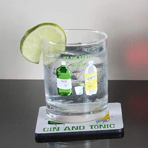 PREMIUM QUALITY: Set of four coasters, packaged in a printed open-faced box, are made from MDF with a cork backing. IN-HOUSE DESIGN: "Gin And Tonic", "Let The Party Be Gin", and "Just Renewed My Gin Membership" texts and glass and bottle icons are printed onto individual coasters. PERFECT FOR GIFTING: Perfect for those who wish to show their love of gin and tonic. CARE INSTRUCTIONS: Wipe clean with a damp cloth. MORE PRODUCTS: Lounge pants, t-shirts, and glassware in the same style are also available.