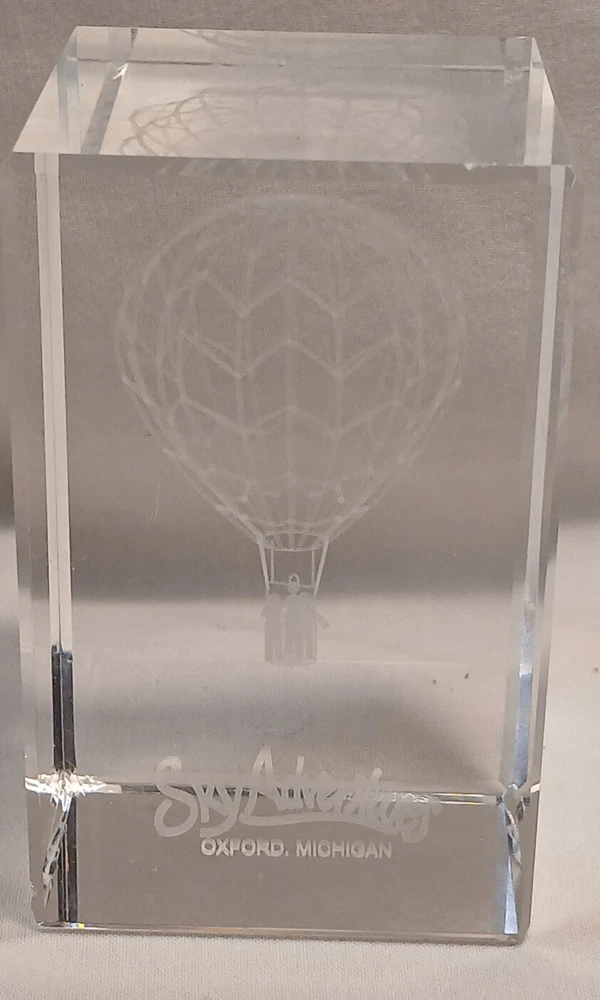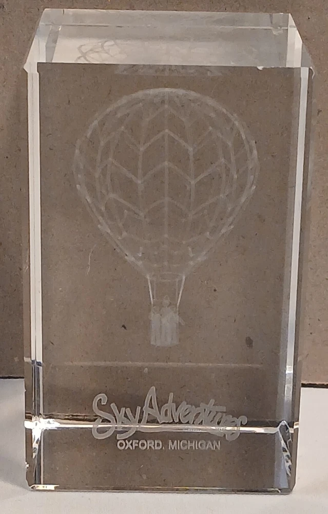 This item is pre-owned with no damages chips or cracks. You receive the same item pictured, the tape measure is shown for size reference. Etched glass depicting a hot air balloon and says Sky Adventures Oxford, Michigan. Carefully packed and quickly shipped by the next business day