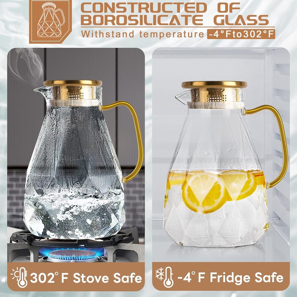 DIAMOND PITCHER: 2.2L original diamond pattern water jug, suitable for families of 3-5 people, full of design sense, full of aesthetics of life HIGH BOROSILICATE GLASS: The glass jug can withstand the temperature from -4℉ to 302℉, can be heated directly with an open flame or electric ceramic heaters, or placed directly in the refrigerator for cooling. Stable without bursting, suitable for all types of cold and hot drinks ELEGANT DESIGN, MORE PRACTICAL: Specially designed with an anon-dripping spout and ergonomically designed handle makes it easy to hold and pour. The handle is widened and thickened, it is not easy to heat after heating. Our glass water carafe is both sturdy and light, it can be used for ages. The lid is made of 304 stainless steel. If the lid becomes loose when pouring water, remove the silicone ring from the lid and put it in the opposite direction, and the lid will become tight A WONDERFUL CHOICE AS A GIFT: The practical and beautiful juice pitcher can basically meet your family's daily needs. I bet you will need a gift for Serving on Christmas, New Year's Day, Easter, Halloween, housewarmings, and Other parties. This glass jug has durable glass, an elegant body, and beautiful color box packaging, It is a beautiful gift for women and men PERFECT AFTER-SALES SERVICE: The water pitcher does not contain BPA, lead and other harmful ingredients. Baby-safe silicone ensures your health and safety. Dishwasher safe but hand wash recommended. Glass products are difficult to avoid damage during transportation. Although the probability is very small, if you receive an incomplete product, please contact me and I will refund you without any reason. Buy with confidence