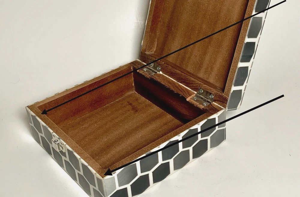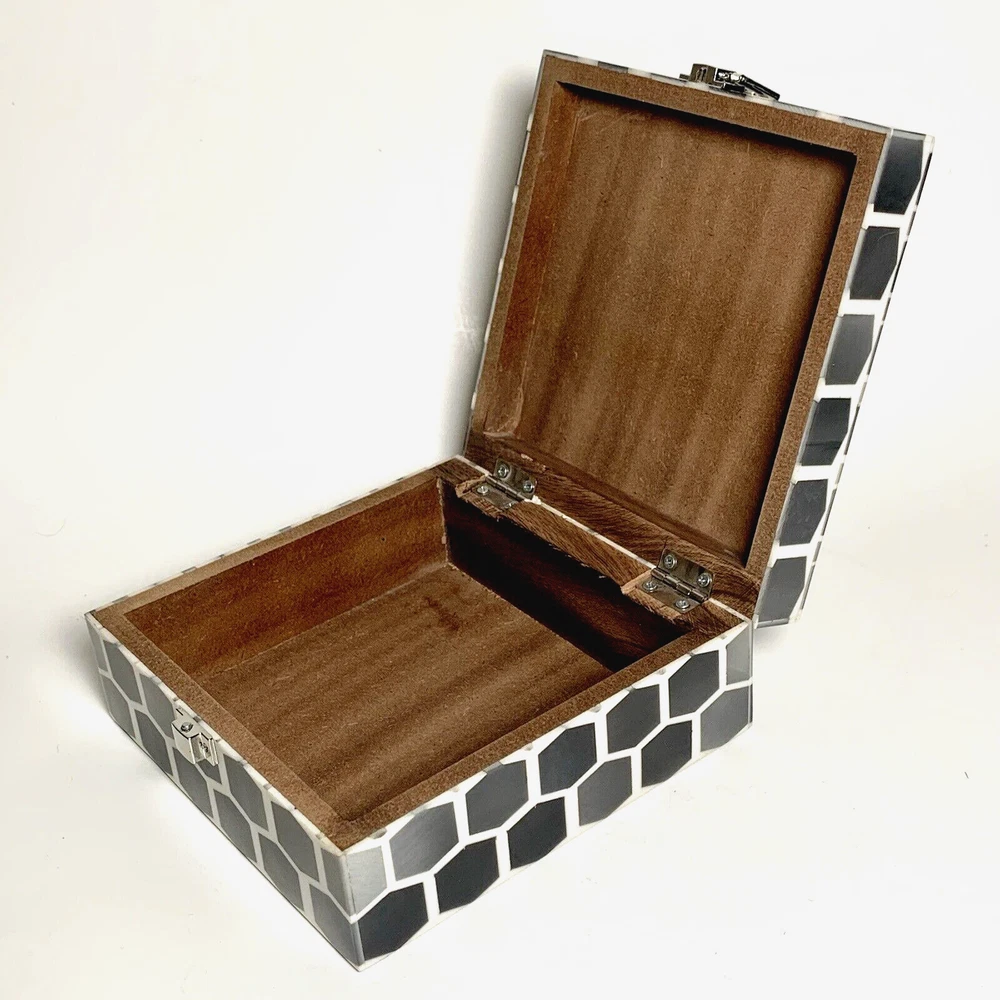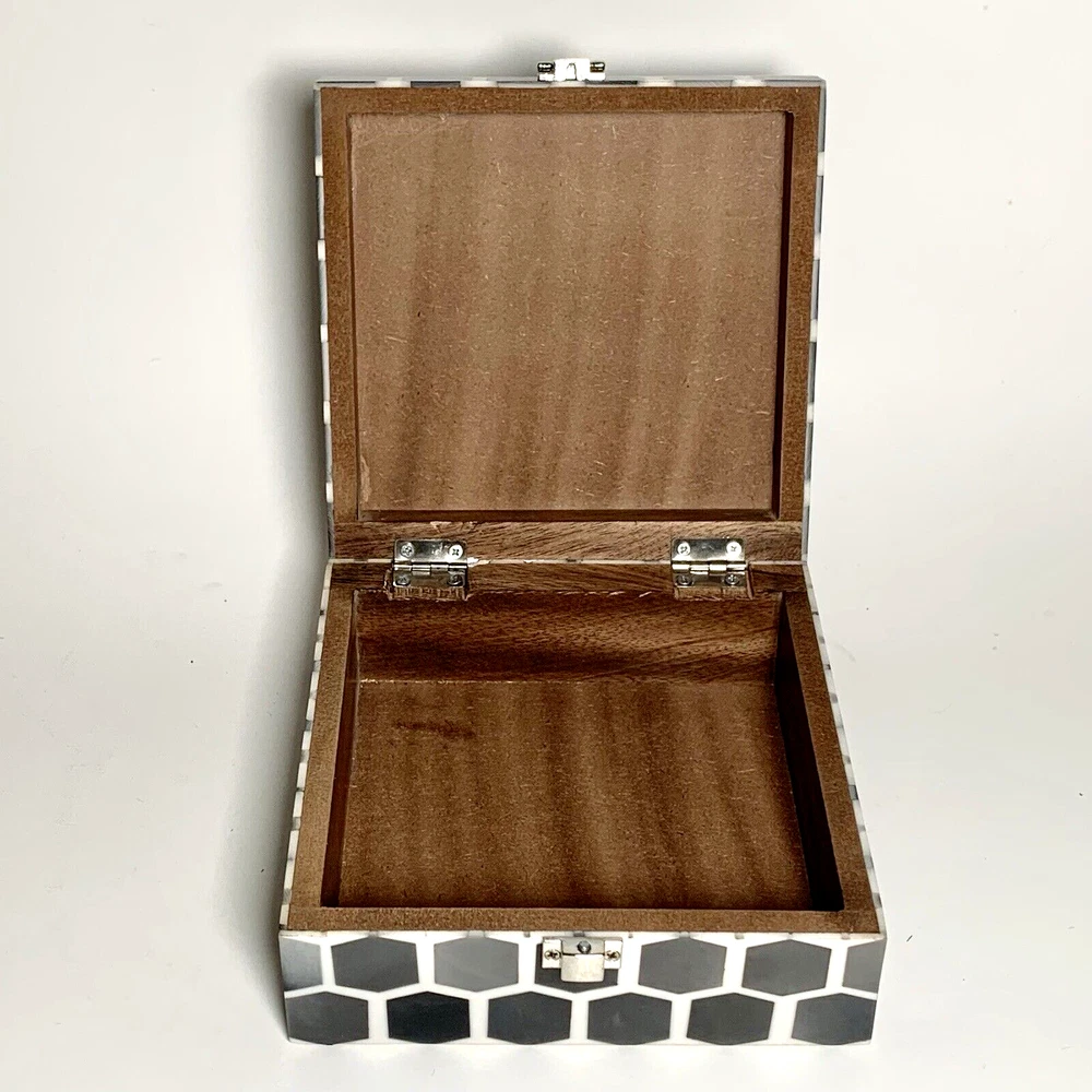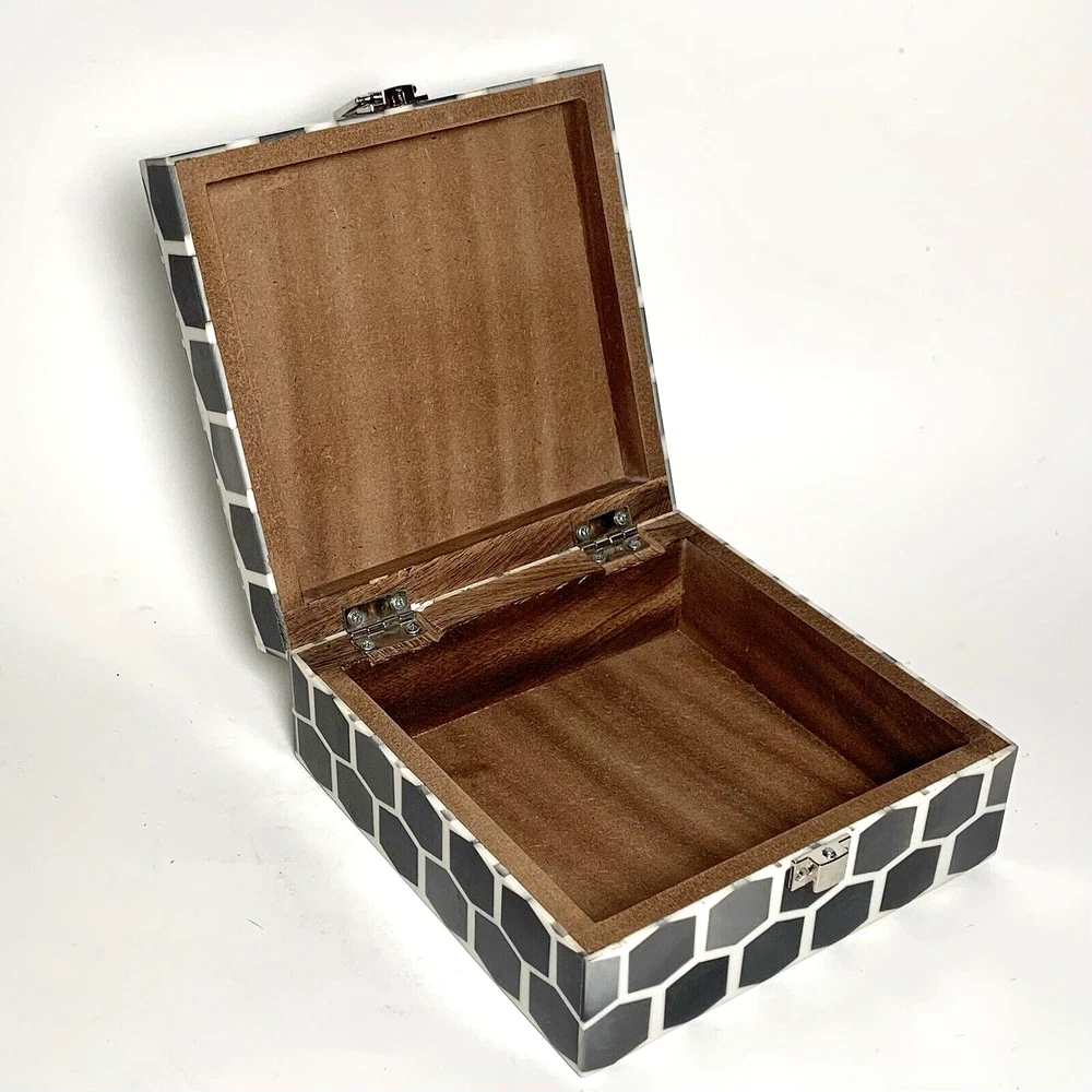 Global Views Storage-Trinket-Keepsake Box Substantial Wooden Inside Inlaid Bone and Resin Black, Grays & Cream Silver toned secure latch and hinges 6" Square A few shallow surface scratches on top. Several tiny chips along edges, on one corner and at base of back right hinge None obviously noticeable. ***I've pointed out a few in close-up photos*** Note: Vintage and pre-owned items will almost always show some signs of usage and wear. I try to describe each item as accurately as possible. ***Please view and enlarge all images for detail and condition verification*** I will gladly combine shipping when feasible. Please contact me for rates if purchasing multiple items. My goal is to provide excellent customer service. If you have any concerns upon receipt, please contact me immediately.