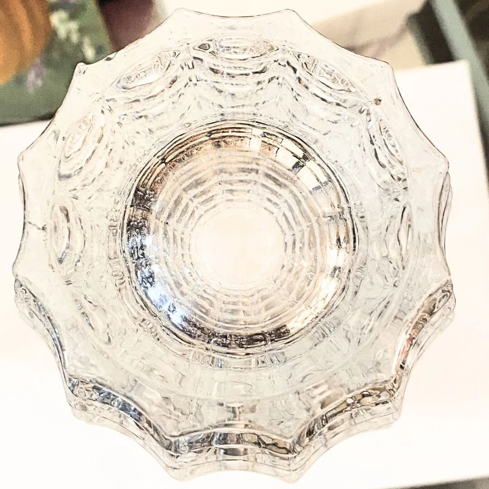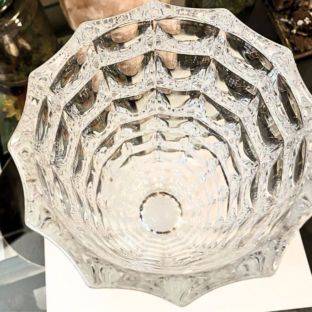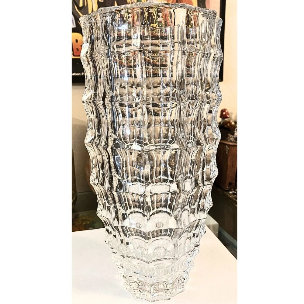 This is a large round crystal vase by Godinger in the "In the Window" pattern. It features a contemporary style with a geometric pattern and textured finish. The vase is waterproof and suitable for indoor use. It is adorned with crystals and has a clear color. This 6.8-inch tall vase is designed for all occasions and is perfect for adult use. It weighs 6 pounds and is part of the 21st Century era. No cracks, or scratching, but there are two minor chips on the bottom of the vase which are pictured in this listing. Please see the photos for visuals.