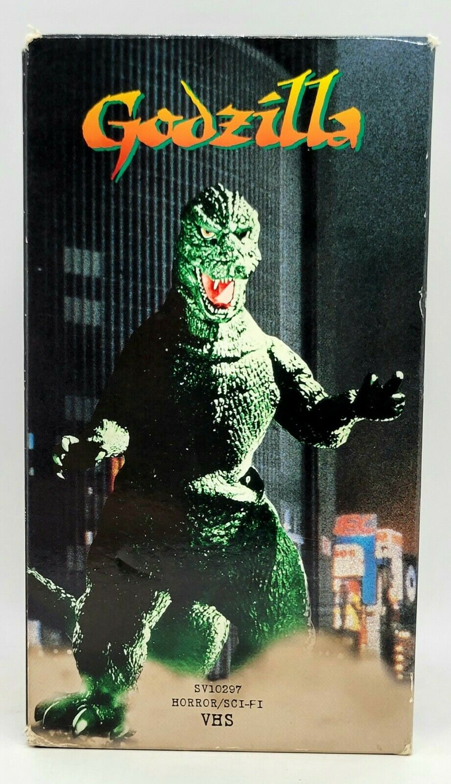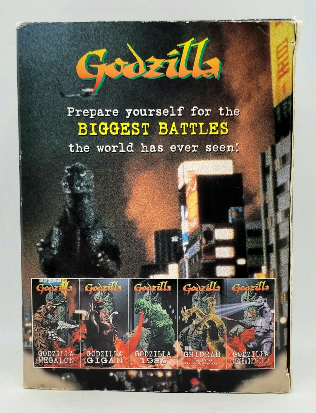 1997 Godzilla VHS set of 5 movies collected into a decorative cover set to form a visually appealing depiction of Godzilla. The movies include the most famous of his battles. Godzilla vs Megalon Godzilla vs Gigan Godzilla 1985 Godzilla vs Ghidrah The Three Headed Monster Godzilla vs Mechagodzilla Condition: The quality of the tapes are not verified. The outer box has several issues as the pictures show. Still a unique piece to add to a collection.