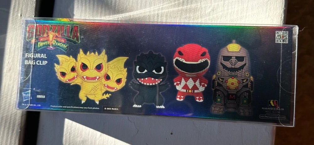Complete set of SDCC 2022 exclusive Monogram Figural Bag Clips released to celebrate Godzilla vs. Mighty Morphin Power Rangers. Set includes Godzilla, King Ghidorah, The Red Ranger, and Dragonzord. Package has never been opened and has been on display on a shelf. If more pictures are desired, please contact me.