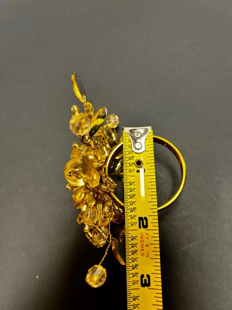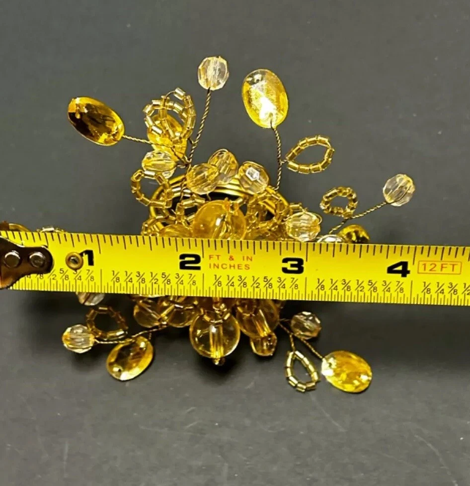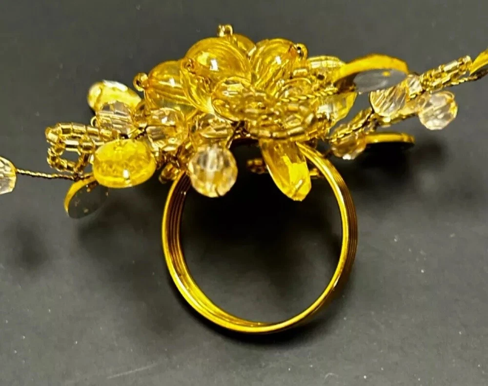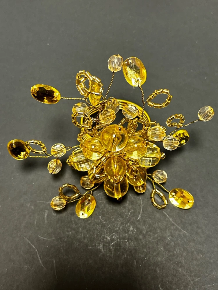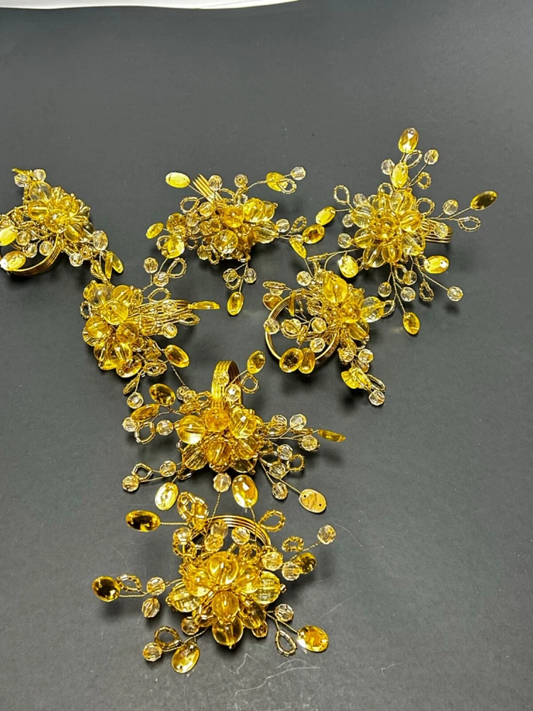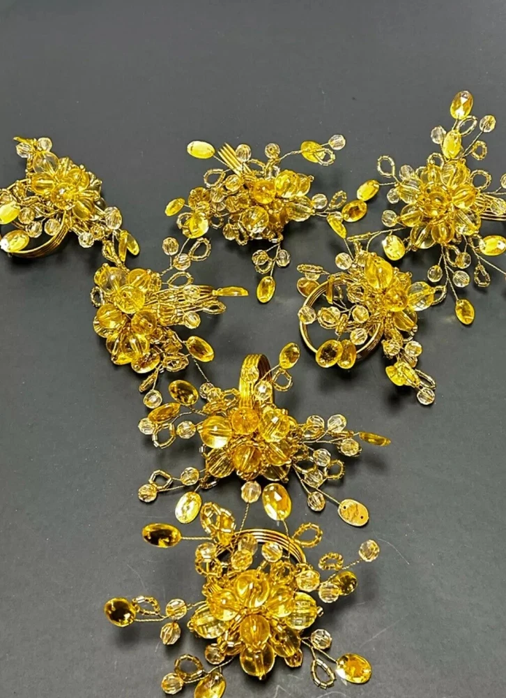 Add a touch of elegance to your dining experience with this set of 7 gold beaded napkin rings. Each ring is made of high-quality metal and adorned with sparkling glass beads, creating a stunning accessory for any occasion. These napkin rings are perfect for adding a pop of color to your table setting and are versatile enough to be used for any multipurpose event. Whether you're hosting a dinner party or simply enjoying a meal with family and friends, these beaded napkin rings are sure to impress.