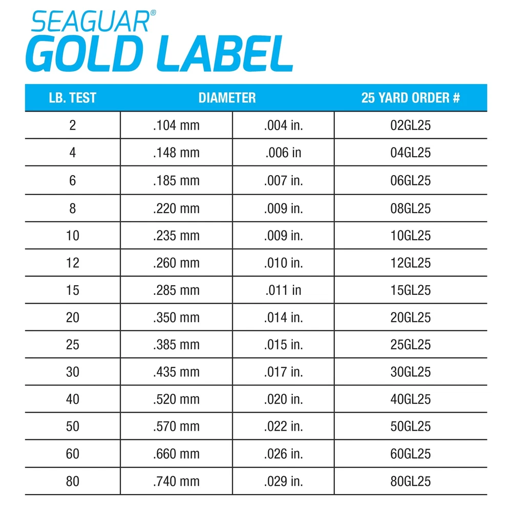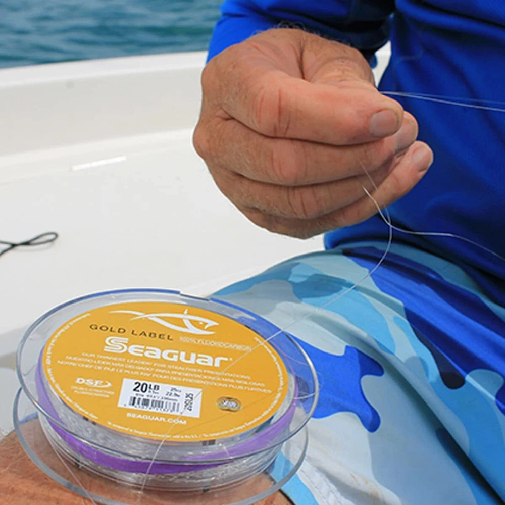 When it comes to chasing finicky fish in crazy-clear water, you can't go wrong with the ® Gold Label Fluorocarbon Leader! Incredibly thin, this saltwater leader is virtually invisible , plus it allows for natural presentations. The soft, supple design means it cinches well, delivering the knot and tensile strength you need to wrestle big saltwater bruisers! Thanks to 's proprietary co-extrusion method that blends a strong, sensitive fluorocarbon core with a soft, supple fluorocarbon exterior, the Gold Label Fluorocarbon Leader delivers the perfect combination of strength, stealth, and suppleness. Incredibly thin, this saltwater leader is virtually invisible , plus it allows for natural presentations. When it comes to chasing finicky fish in crazy-clear water, you can't go wrong with the Gold Label Fluorocarbon Leader! Thanks to 's proprietary co-extrusion method that blends a strong, sensitive fluorocarbon core with a soft, supple fluorocarbon exterior, Lowest line memory compared to other Fluorocarbon leaders, making line management more user friendly Maximum Impact and Knot Strength. Fast Sinking Line Helps Reach The "Strike-Zone" Quicker