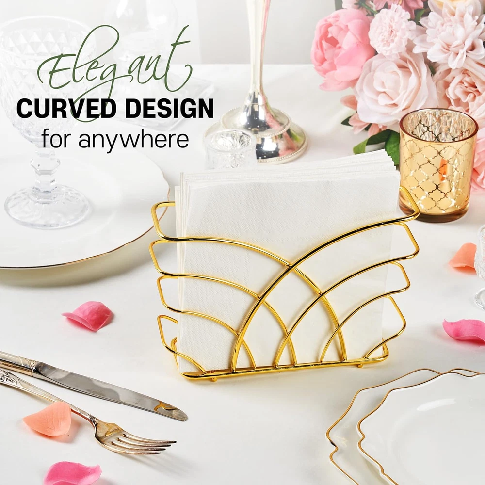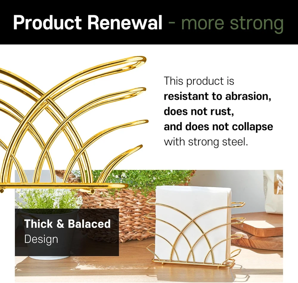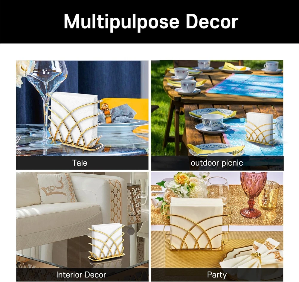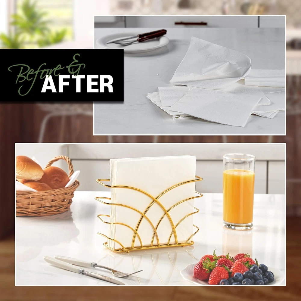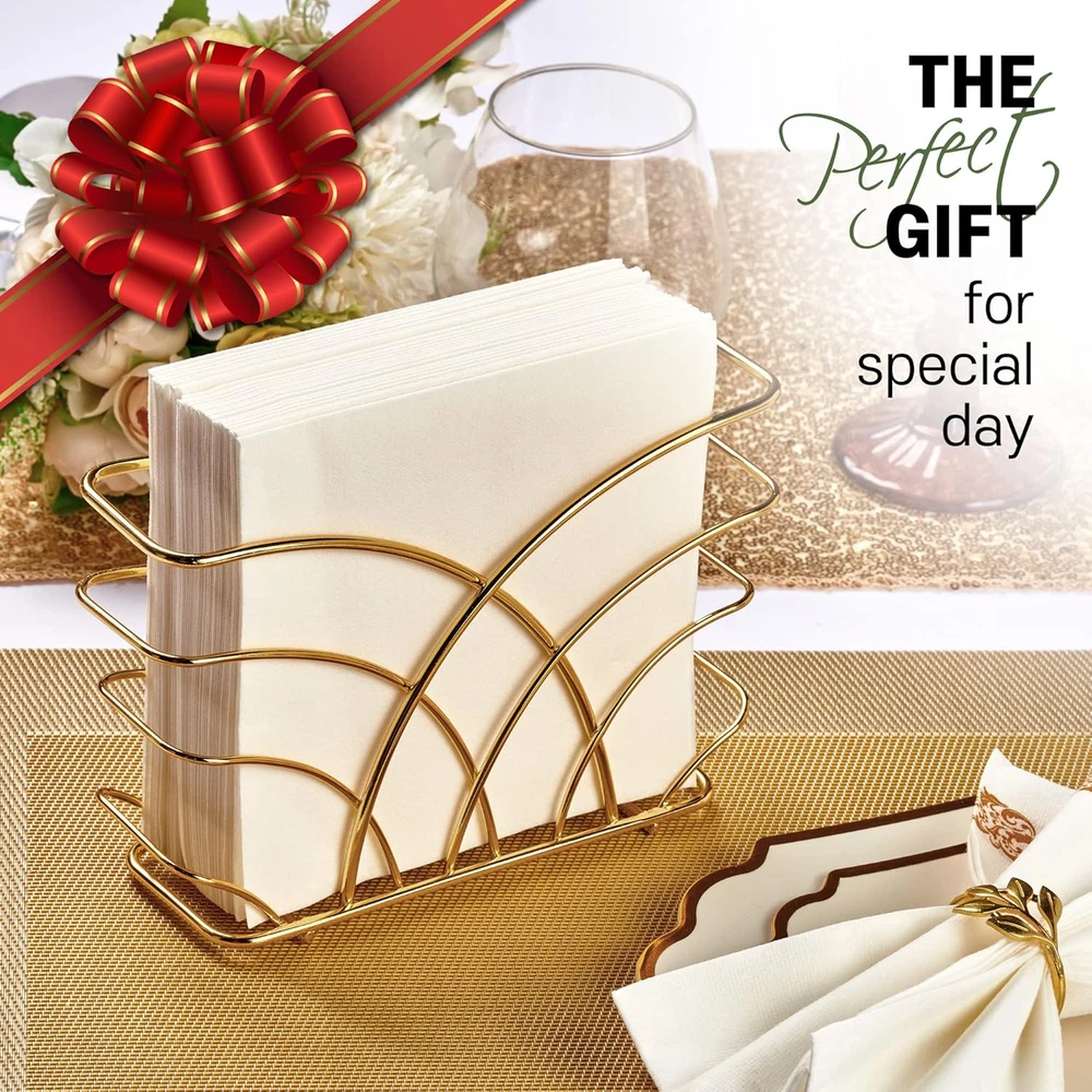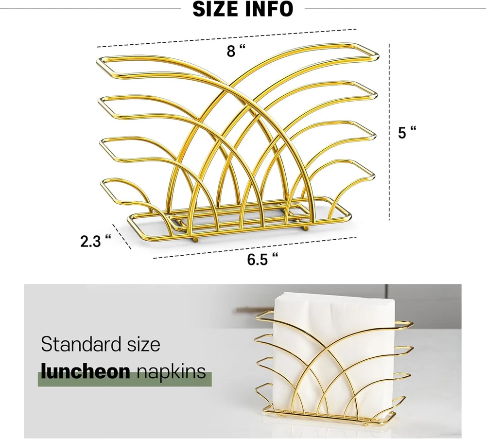Store New Arrivals Add to Favorite View Feedback Contact Gold Napkin Holder for Table - Luxurious Metal Napkin Holder for Table, Kitchen & Dining Decor, Elegant Gold Kitchen Accessories and Tabletop Decor, Ideal for Modern Home Decorations Description Item model number LEVI051 Style modern Color R - Luncheon Napkin Holder - Gold Material Steel Country of Origin China Item Weight 0.28 Kilograms Product Dimensions 2.3"D x 8"W x 5"H Size Luncheon Napkin Holder Please Note: Due to the nature of gold metal, the product color may differ slightly from the images shown. Color may appear different depending on the environment or lighting. Napkin holder for Luncheon Napkins (6.5" x 6.5") Luxury Meets Functionality: The gold napkin holder offers a lustrous shine that elevates any setting, perfect as a standout piece among your gold kitchen decor. Its sturdy build ensures practicality meets opulence. Versatile Table Companion: Crafted as the perfect napkin holder for table, this accessory fits seamlessly from everyday meals to special gatherings, enhancing your dining table decor and accessories. Stylish Kitchen Addition: Incorporate a touch of glamour with this gold kitchen accessory, designed to complement both contemporary and classic interiors, making it an essential part of your gold kitchen table ensemble. Durable and Easy Maintenance: Made with high-quality materials, our servilletero dorado resists tarnish and wear. A quick wipe keeps it looking splendid, making upkeep a breeze while keeping your space neat. Elegant Gift Choice: Whether it's a housewarming or a wedding, this napkin holder gold blends well with any decor style, making it an excellent gift for those who cherish elegant kitchen decor gold. Decorative Yet Practical: Not just for show, this gold napkin holder for table is robust enough to handle daily use. It's the perfect balance of decorative flair and practicality, suitable for both indoor and outdoor settings. Expand Your Decor: With its versatile appeal, use this holder to enrich your gold kitchen decor and accessories, serving as a harmonious addition to your gold decor for kitchen or as a refined accent in your entertaining arsenal. Easy To Carry : Introducing a cool new design in napkin holders. Our easy to carry is ideal for keeping your kitchen decor sleek and modern. This simple yet stylish stainless steel napkin holder is perfect for placing on the table or countertop, even if you don't have much room. Product Description Gold Napkin Holder, Napkin Holder for Table The video showcases the product in use. The video guides you through product setup. The video compares multiple products. The video shows the product being unpacked. Elevate dining with our Steel Napkin Holder. Melding modern design with space efficiency, it's an essential, stylish addition. Keep napkins within reach in style. LEVIMETREE Gold Napkin Holder LEVIMETREE Gold Napkin Holder will be a great centerpiece for your table. This napkin holder provides space between the table and the napkin, making it easier to use and prevent getting wet. Inspired by flowers in full bloom, a simple yet stylish arching design made of High-quality steel adds elegance. What is the size of this product? The 8" x 5" x 2.3" inch napkin holder is perfect for holding standard sized luncheon napkins, cocktail napkins. What material is this product made of? Is it safe? It is made of high-quality steel, and the wire thickness is moderately thick, so it is very strong. The optimized design of the bottom surface protects your table from scratches. How durable is this product? Will it discolor or damage after long-term use? It is made of steel, so it does not rust and does not discolor. This napkin holder can be used for a long time. How is this product packaged and delivered? Is it suitable for gifting? It is delivered to customers in a modern and simple package design. It is also the best choice as a gift. What style of interior decor does this product best suit? The product was developed with an emphasis on a modern and luxurious concept. No matter where you put it, the product breathes life into that space. Explore LEVIMETREE Brand Napkin Holder Add to Cart Add to Cart Add to Cart Add to Cart Add to Cart Add to Cart Customer Reviews 4.7 out of 5 stars 5,004 4.7 out of 5 stars 5,004 4.7 out of 5 stars 37 4.7 out of 5 stars 5,004 4.7 out of 5 stars 5,004 4.7 out of 5 stars 5,004 4.7 out of 5 stars 5,004 Price $15.90 $ 15 . 90 $15.90 $ 15 . 90 $29.90 $ 29 . 90 $15.90 $ 15 . 90 — $17.90 $ 17 . 90 $17.90 $ 17 . 90 material Steel Steel Airlaid Paper Cast Iron Cast Iron Cast Iron Cast Iron napkin types Luncheon, Cocktail Napkin Luncheon, Cocktail Napkin Bathroom, guest use Guest, Dinner, Cloth Napkins Guest, Dinner, Cloth Napkins Guest, Dinner, Cloth Napkins Guest, Dinner, Cloth Napkins Space Available Multi-purpose Multi-purpose bathroom, table, dinner Multi-purpose Multi-purpose Multi-purpose Multi-purpose Product Size 8.3 x 5 x 2.7 inch 8.3 x 5 x 2.7 inch 8.5 x 4 inches 9 x 2.3 x 5.3 inch 9 x 2.3 x 5.3 inch 9.2 x 1.7 x 5.3 inch 9.2 x 1.7 x 5.3 inch BRAND LEVIMETREE LEVIMETREE LEVIMETREE LEVIMETREE LEVIMETREE LEVIMETREE LEVIMETREE Explore more from LEVIMETREE Silver Steel Napkin Holder With a compact design, it does not take up table space and is a napkin holder that looks good anywhere. Experience the ideal table dining experience Gold Stainless Steel Napkin Holder With a compact design, it does not take up table space and is a napkin holder that looks good anywhere. Experience the ideal table dining experience Salt & Pepper Shaker Napkin Holder Excellent Choice for Your Home Unique Design: The napkin salt pepper caddy has a rustic-inspired design that adds a lovely vintage touch to your home. Gold Guest Towel Napkin Holder Multipurpose Napkin Caddy for Dinner Table, Bathroom or Kitchen Countertop Silver Napkin Holder for Bathroom LEVIMETREE Guest Towels Holder Tray for Bathroom Silver Napkin Holder for Bathroom Guest towel napkin