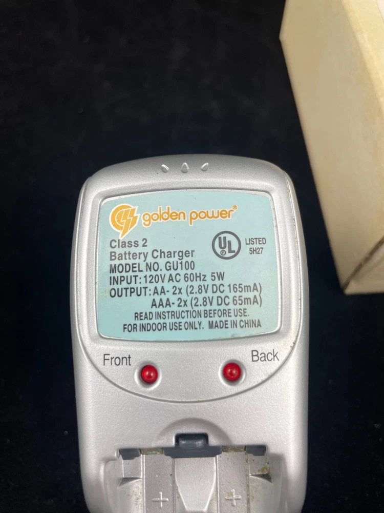 This Golden Power Class 2 AA or AAA Rechargeable Battery Charger is a reliable and efficient way to charge your batteries. It is compatible with both AA and AAA batteries and has a voltage input of 120V AC 60Hz 5W. The charger is designed for multipurpose batteries and power and is perfect for use with consumer electronics. With this charger, you can easily charge your batteries and keep your devices running smoothly. It is a great addition to any battery charger collection and is sure to be a valuable resource. Don't miss out on this opportunity to power up your devices with ease! For inventory - Mary Box