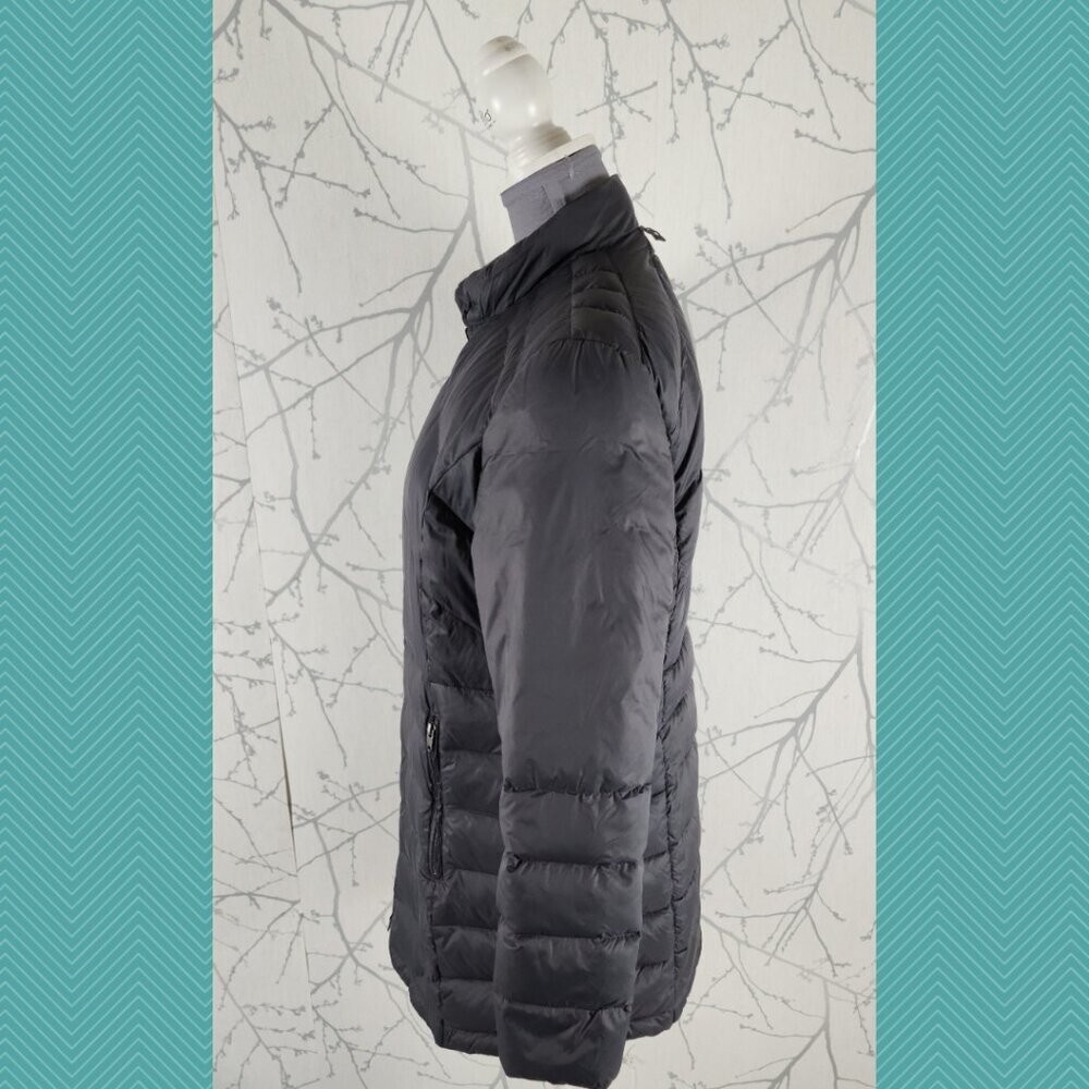 Gotcha Glacier Gray Down Filled Full Zip Midi Puffer Jacket reversible but it looks like the same on the other side and the tags will have to be removed Women's L Chest: 20" Length: 32" Good used condition: no rips, marks or stains.