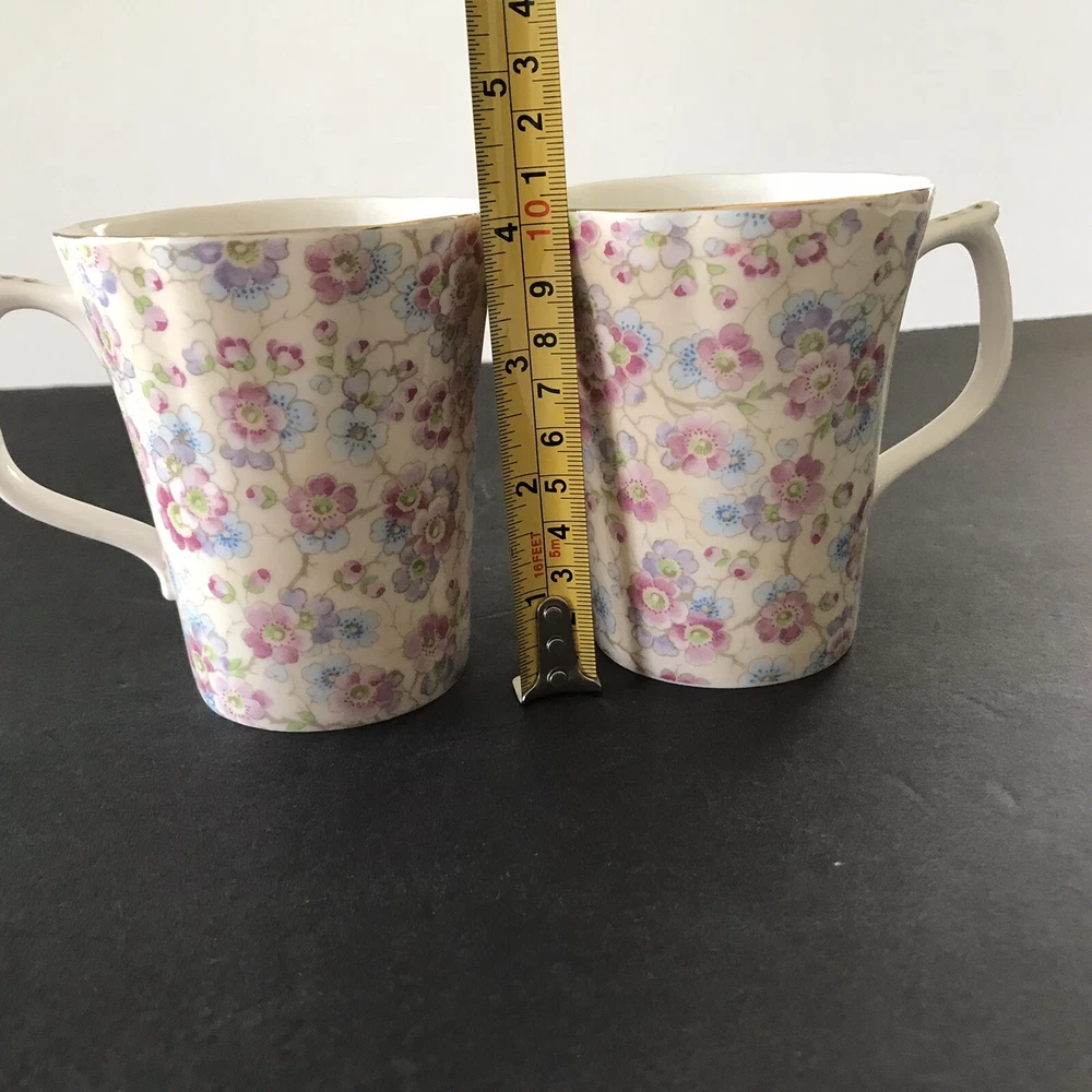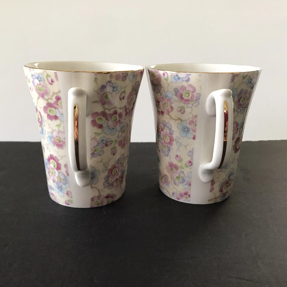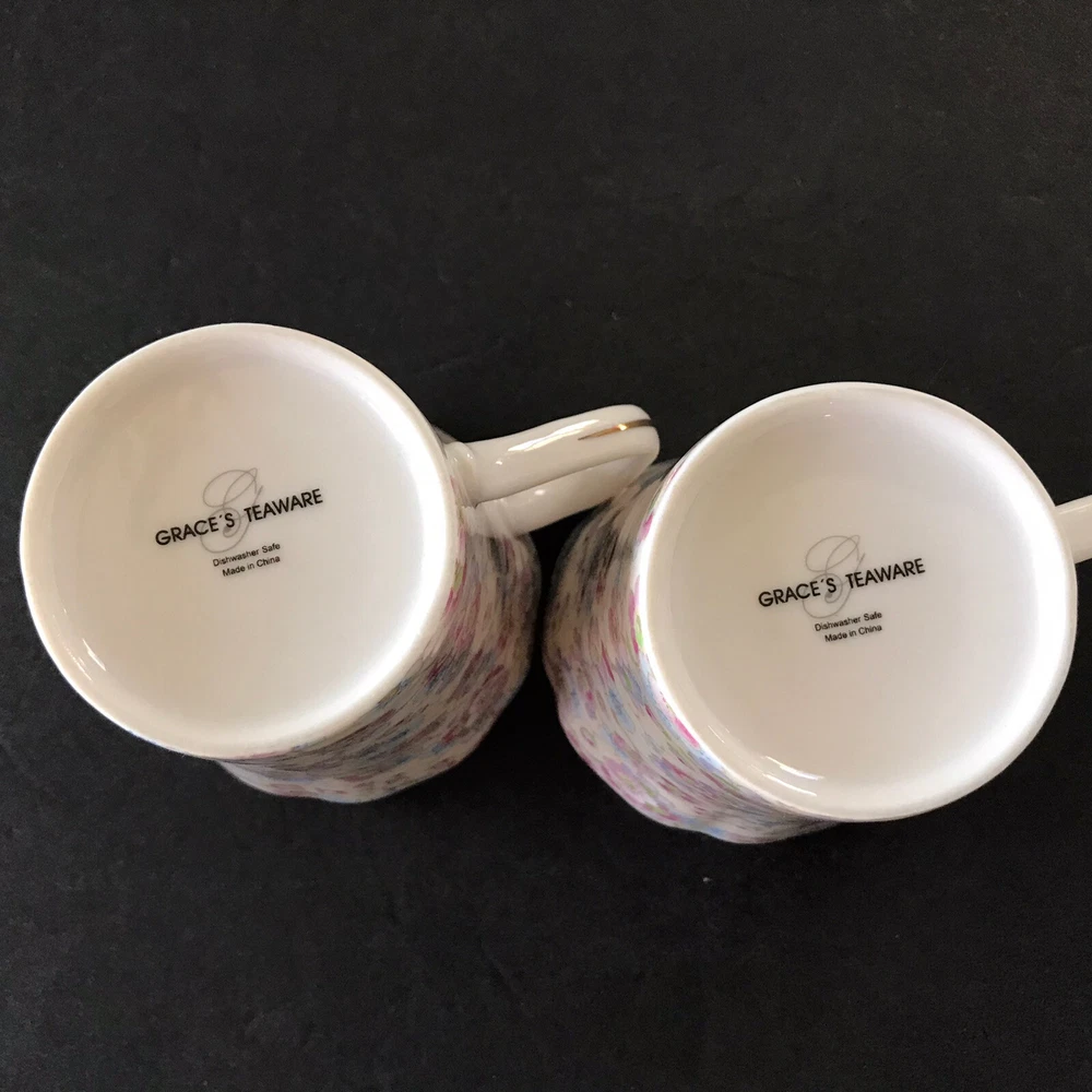 Grace's Teaware Two Pink Floral Scallop Rims with Gold Trim Tea Coffee Mugs Cups with Thumb Rest 9 fl oz Capacity Used in Good Condition: No Chips, Cracks, Crazing, Scratches or Staining Thank You for Viewing